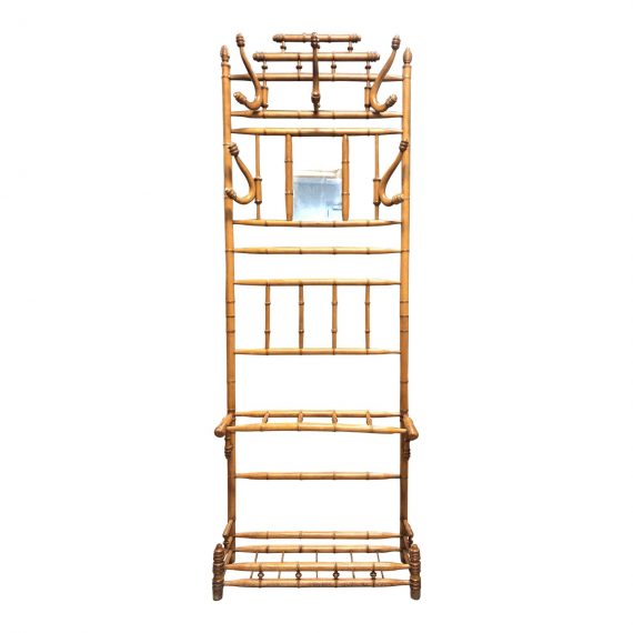 Design Plus Gallery presents a hall tree. Inspired by Asian designs. The frame is constructed of bamboo. Consist of five hooks and two slated shelves. A small rectangular mirror will let you get that last minute glimpse before you walk out the door. Visible wear. Narrow in size, good for most entry ways.