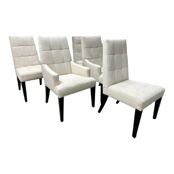 Design Plus Gallery presents a Set of Six Dining Chairs by henredon. Designed by Barbara Barry. Features tapered legs finished in a dark wood tone. Upholstered in a cream linen-blend fabric with tufted detailing. Minor wear on fabric + legs from usage and age. Made in North Carolina USA.