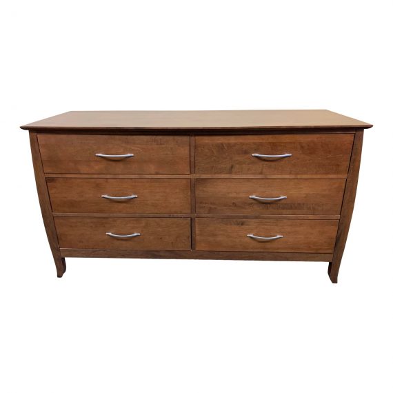 Design Plus Gallery presents a Baronet Maple Six Drawer Dresser. Curved stainless steel pulls complement curvature to the slightly bowed shaped sides & arched feet of this anchoring storage unit. Mixes well with other wood tones in a bedroom.