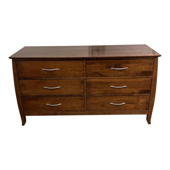Design Plus Gallery presents a Maple Wood Six Drawer Dresser form Baronet of Canada. The dresser will be a modern and stylish addition your bedroom. Finished in a Java tone, this dresser adds warmth and sophistication to the space. Each drawer is equipped with silver-tone arc pulls, offering a sleek and modern touch. The cabinet frame of the dresser is designed with subtle bow-shaped sides, adding a touch of elegance to the overall look. The gently arched feet, finished with a walnut stain, provide stability and a slightly raised appearance. Overall the dresser is in good condition with wear that is considered consistent with age + use. Made in Canada.