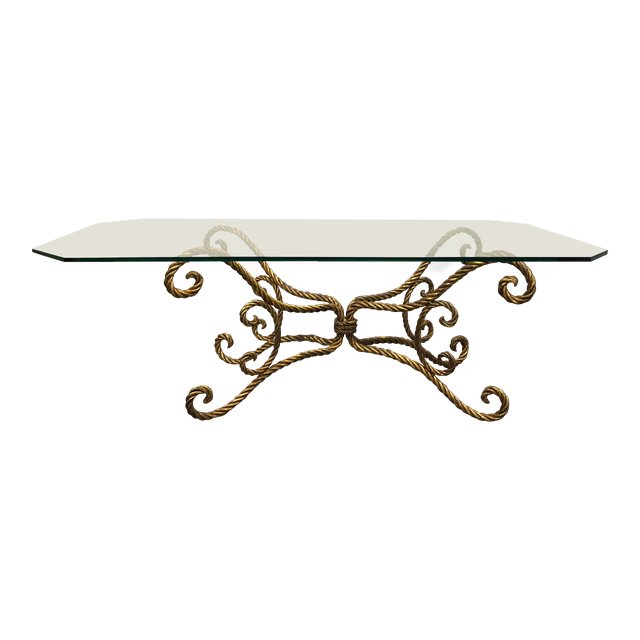Design Plus Presents an Ornate Style Metal Scroll Base and Glass Coffee Table. Steel, gold painted rustic style base resembles twisted French Cord. A rectangular octagonal glass top adds modern structured lines to the effortlessly flowing and ornately designed base, itself reminiscent of a Baroque styling.