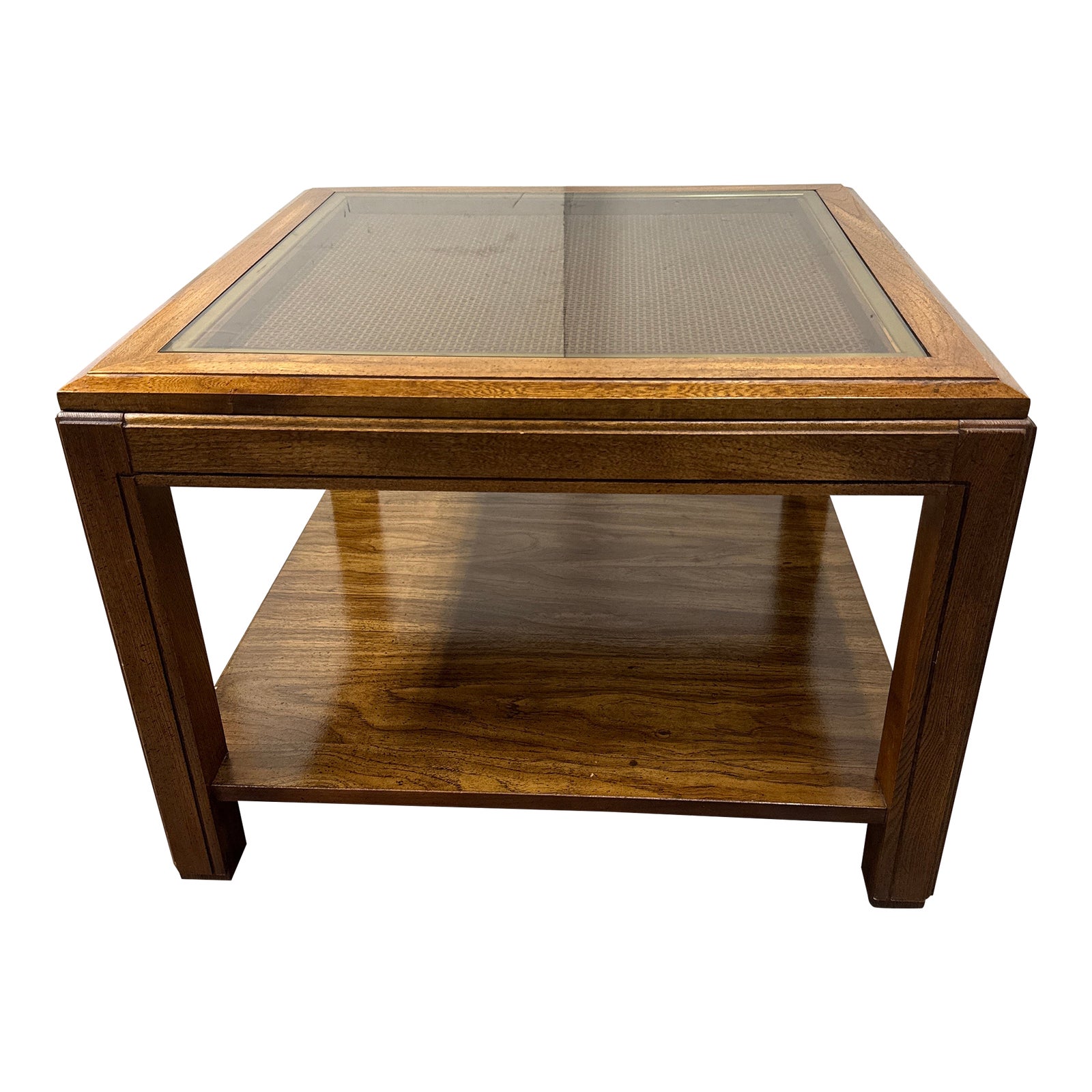 Design Plus Gallery presents a Mid Century Modern Side Table from Basset Furniture. The table has a mid brown, near honey color, with cane top under a slightly smoky glass surface. Is in good condition with minimal wear for its age + use. Made in the USA.