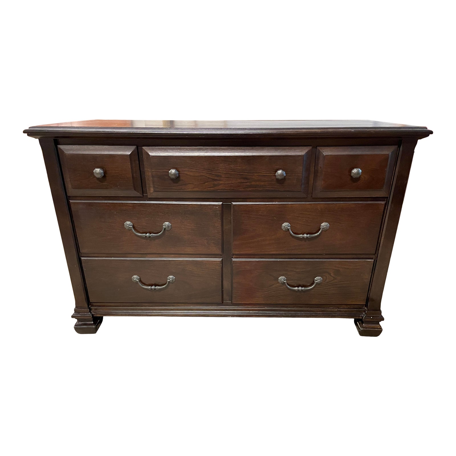Design Plus Gallery presents a Bassett Furniture Seven Drawer Dresser. Solid maple frame is stained a rich chestnut tone on the exterior. Pewter pulls accent the wood beautifully. Baluster feet complement the traditional moldings through out. Top middle tray consists of a flip down construction with an electrical cut out on the back panel for devices. Drawers are constructed with dovetail joinery. Visible and Minor wear.