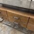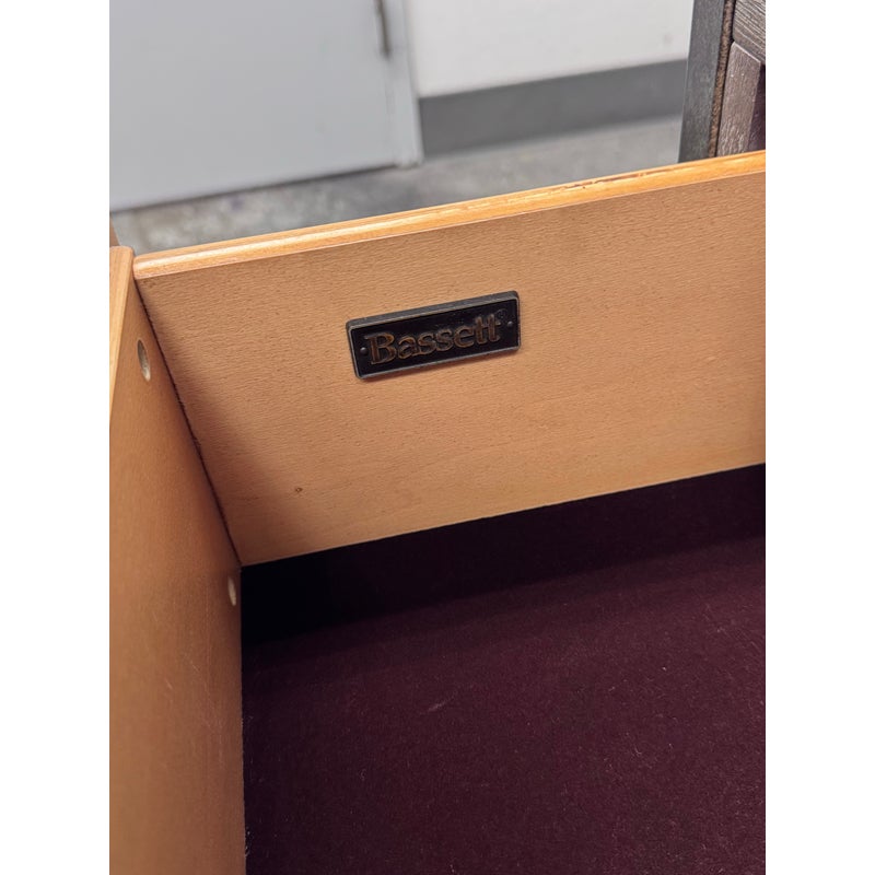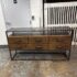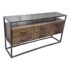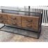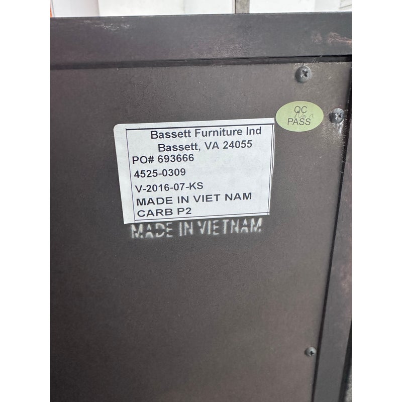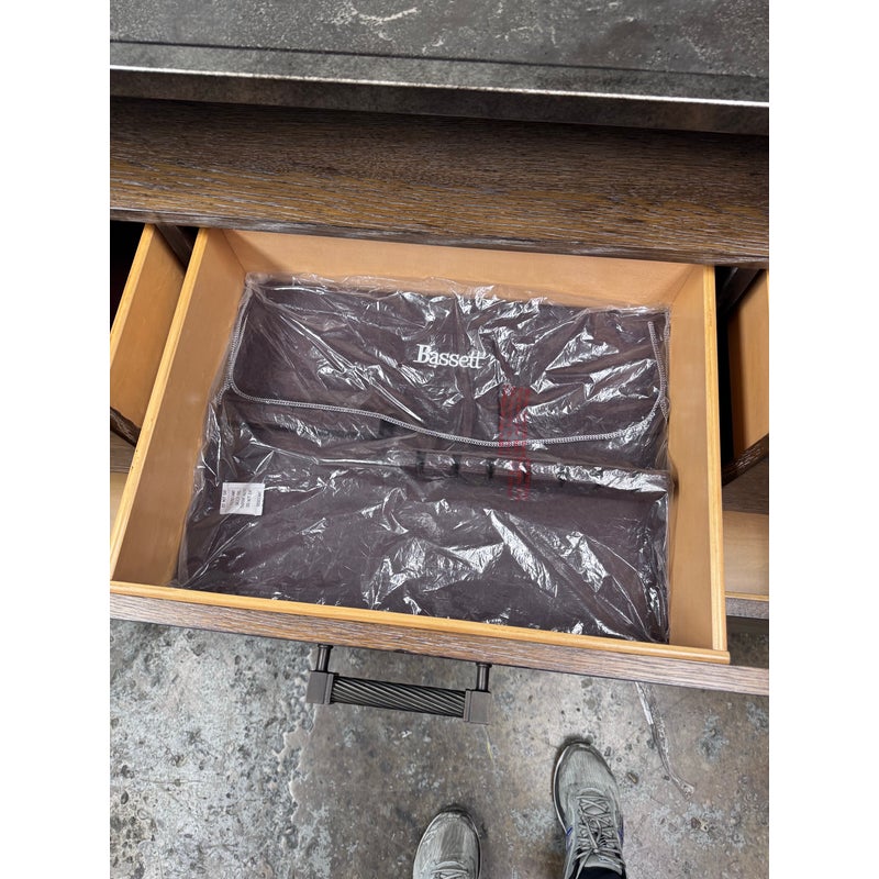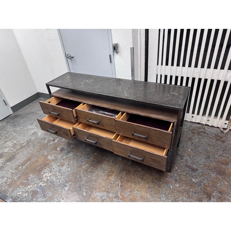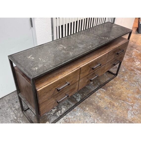 Design Plus Gallery presents a Console Table from Bassett Furniture. The console combines industrial character with refined craftsmanship with its sturdy metal frame and distressed wood finish. The open base creates a balanced silhouette that feels both substantial and airy. The console is fitted with six wooden drawers with visible natural grain variations and an earthy tone. Metal bar drawer pulls add a functional, industrial accent while maintaining a cohesive, industrial aesthetic. This is a style is no longer in production with the brand and is in good condition with wear that is consistent with usage.