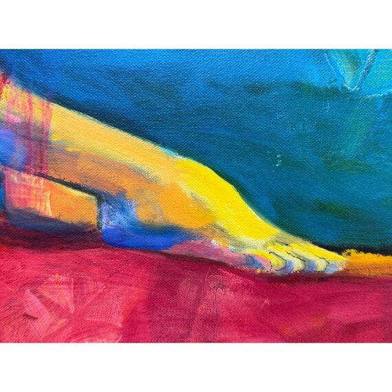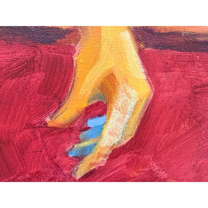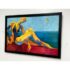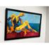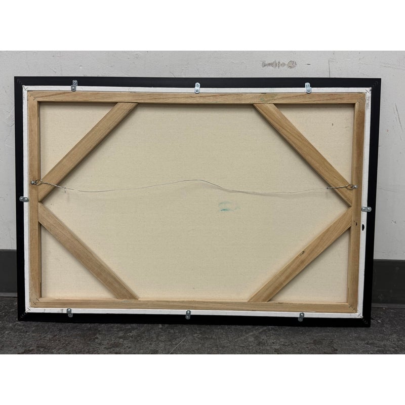 Design Plus Gallery presents a “Bathing Beauty” Original Oil Painting by Unknown Artist. An acrylic on canvas figurative painting depicting a reclining swimmer against an ocean horizon, rendered with expressive brushwork and layered, high-contrast color blocks that create depth across the figure and seascape. The composition balances saturated yellows, blues, and reds with gestural sky markings and subtle geometric motifs, while the custom black frame provides a defined border that complements the artwork’s energetic palette and contemporary styling. There is no artist signature. It is in good condition, with visible and minimal wear from usage.