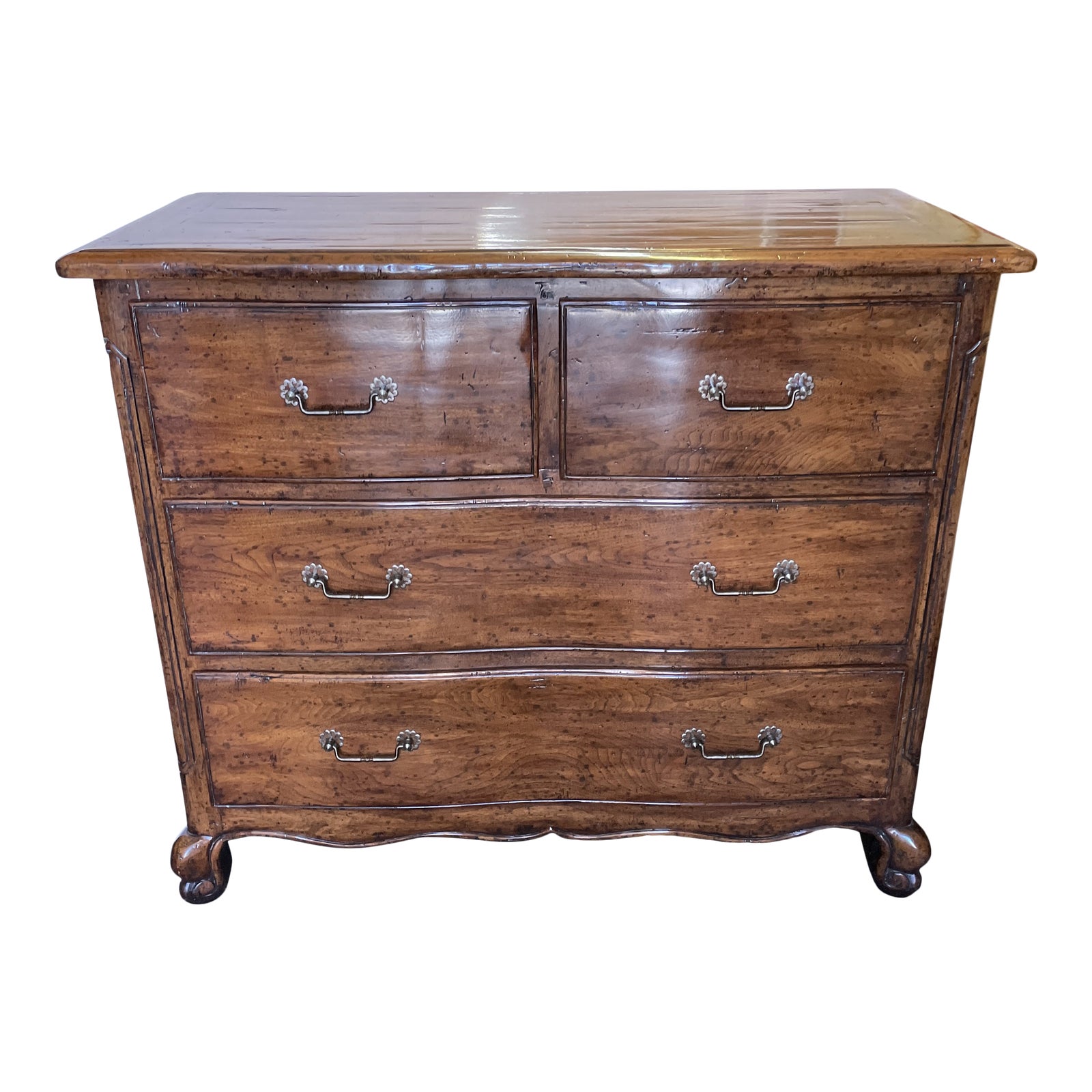 Design Plus Gallery presents a Bausman & Company. Eclectic Collection French Chest. Fruitwood is softly finished with a satin coat preserving the beautifully distressed and antiqued look. Top is a mitered plank surface. Face of chest has a bombe like curvature which is beautifully complemented with antiqued pewter pulls. Minor wear through out, unit is in lovely condition.