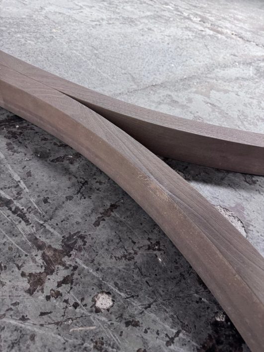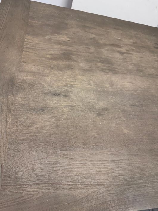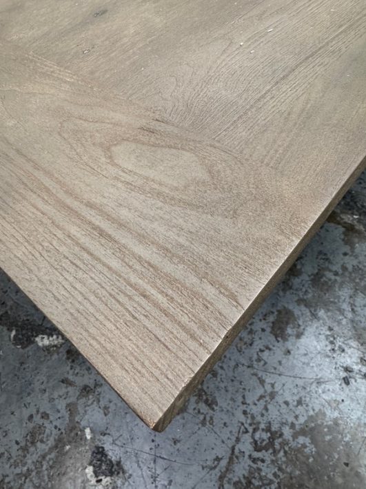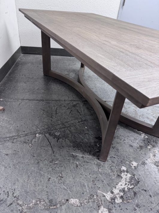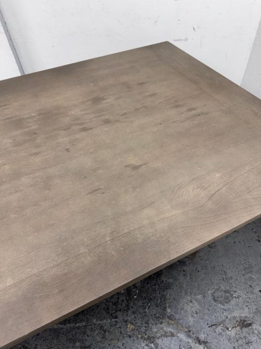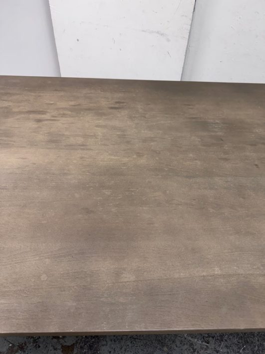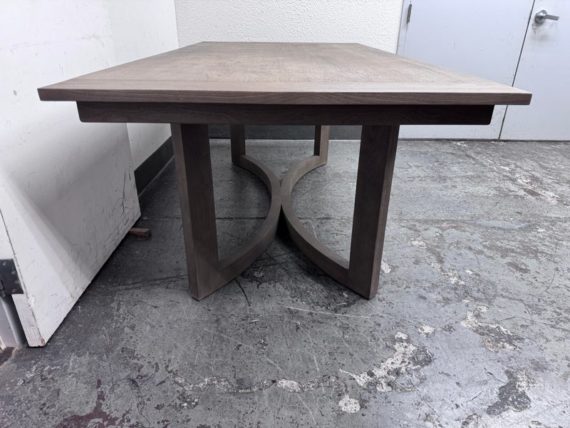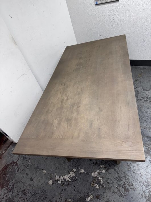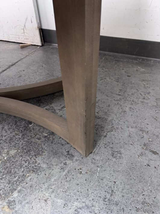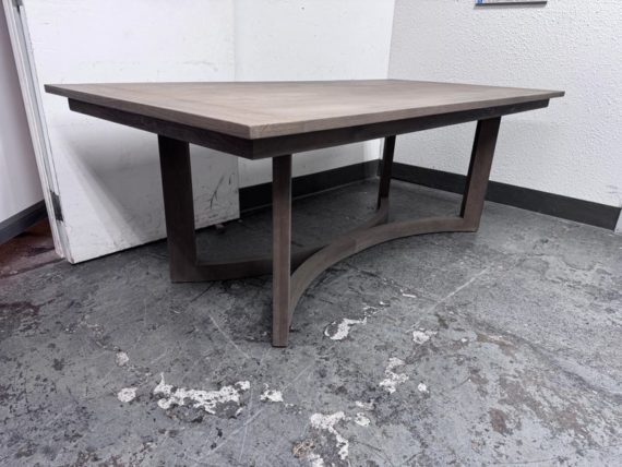 Design Plus Gallery presents a Dining Table with a Double Curved Stretcher from Bausman Fine Furniture. The table is finely crafted of solid woods and in a greywash finish, rustic styling. Plank surface that is smooth a base that is unique to their design. Table style is #2773. Is in good condition with surfaces wear that is visible but considered consistent with its age + use.