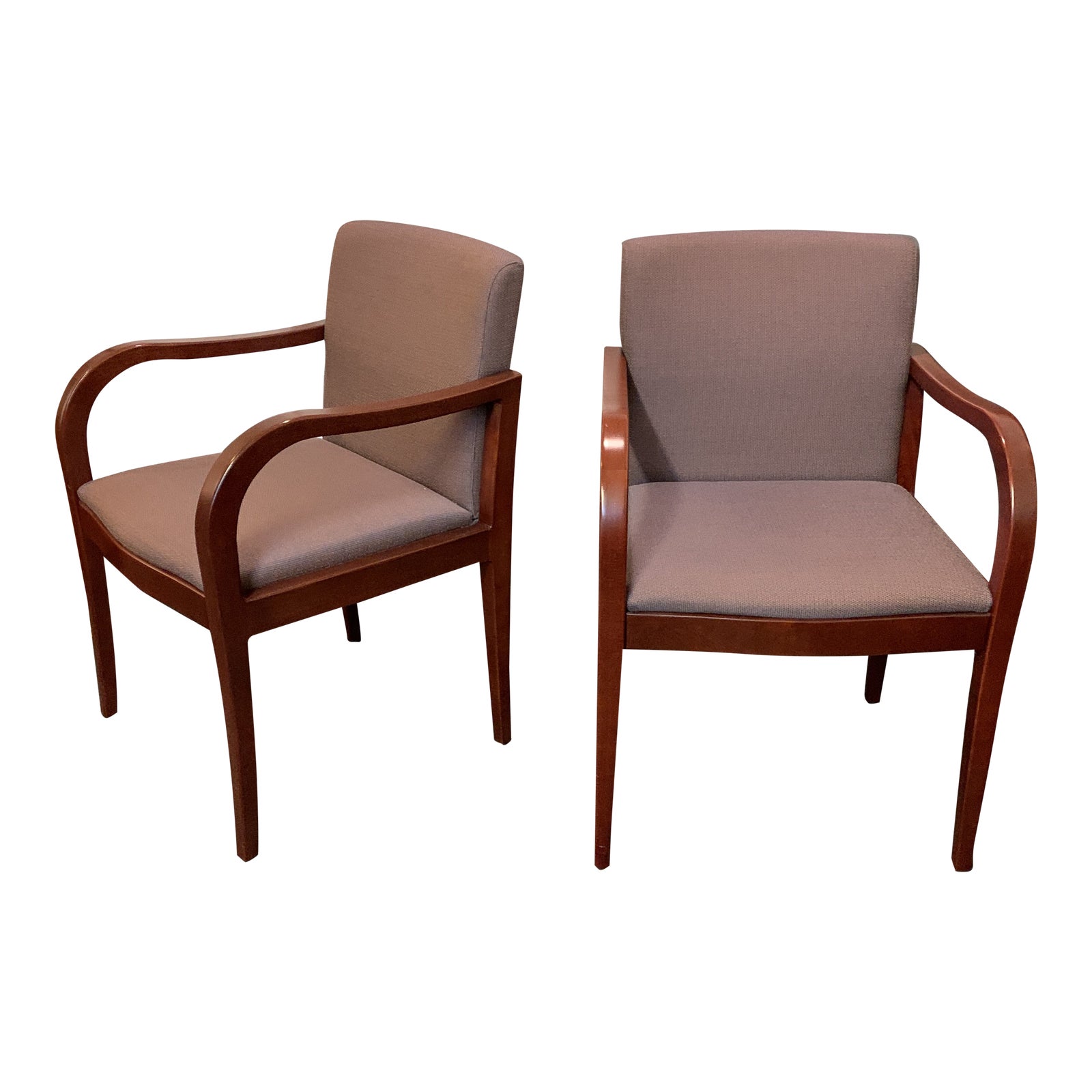 Design Plus Gallery presents a pair of arm chairs. Finished in a glossy cherry hue, the pair of clean lined armchairs offer comfort in a simple style. Easy to move where needed, the pair is upholstered in a multicolor woven fabric that reads blue/gray from a distance.