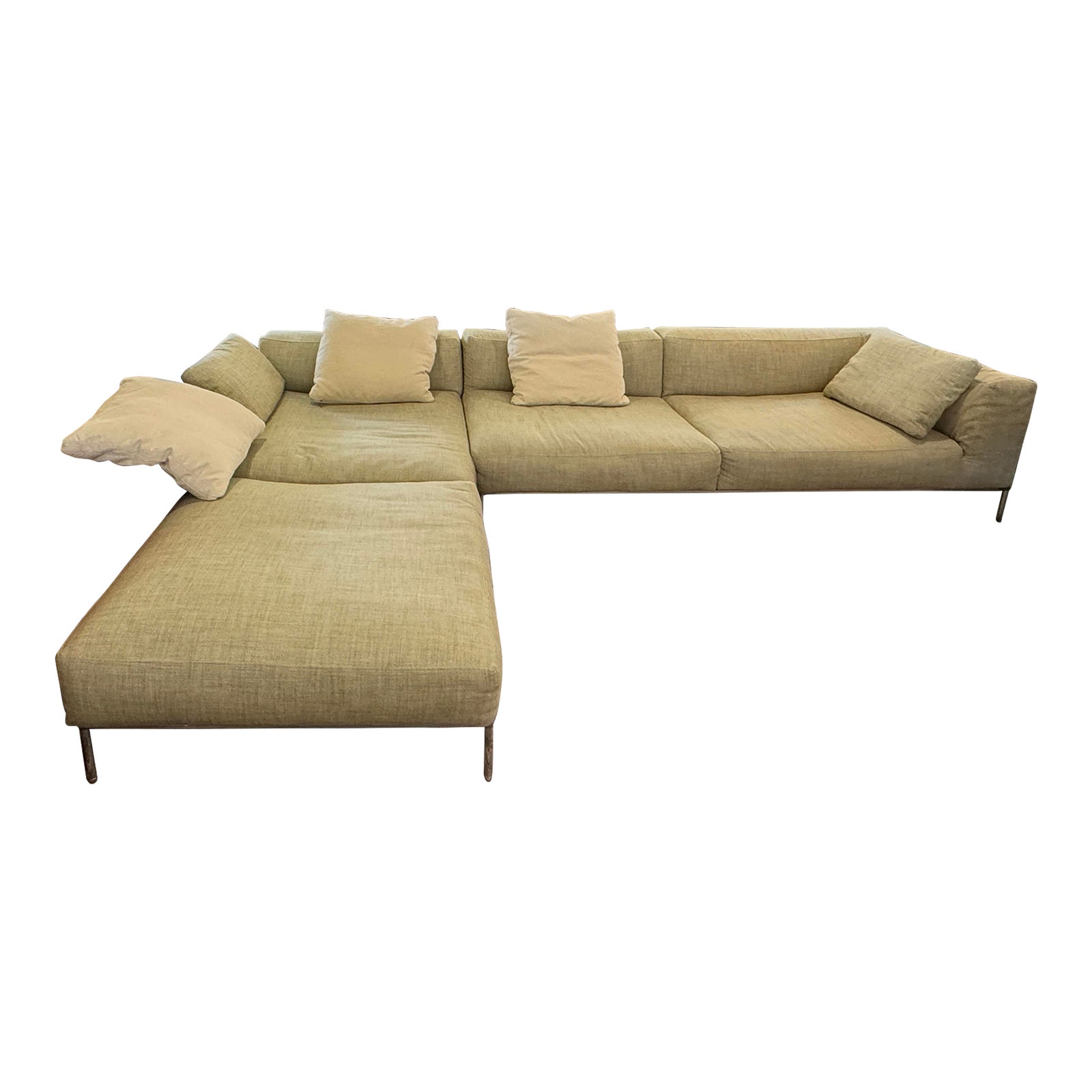 Design Plus Gallery presents the Frank Sectional by B&b Italia. With a combination of a three seat sofa + a chaise + wood bench, this Frank composition offers a great seating solution. The heathered wool upholstery, in an oatmeal hue, wraps the low slung, voluptuous sectional beautifully. The seating is elevated on stainless steel base and legs. An organic modern bench, marrying stainless steel legs with wide plank wood, create a unique backdrop to the chaise, or as a stand alone unit. Visible surface wear on bench, sofa and chaise are in good condition for age and use. Made in Italy.
