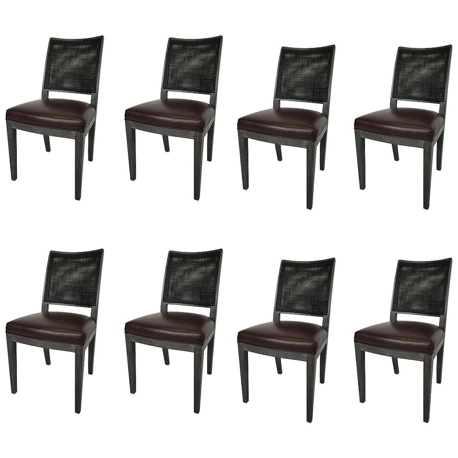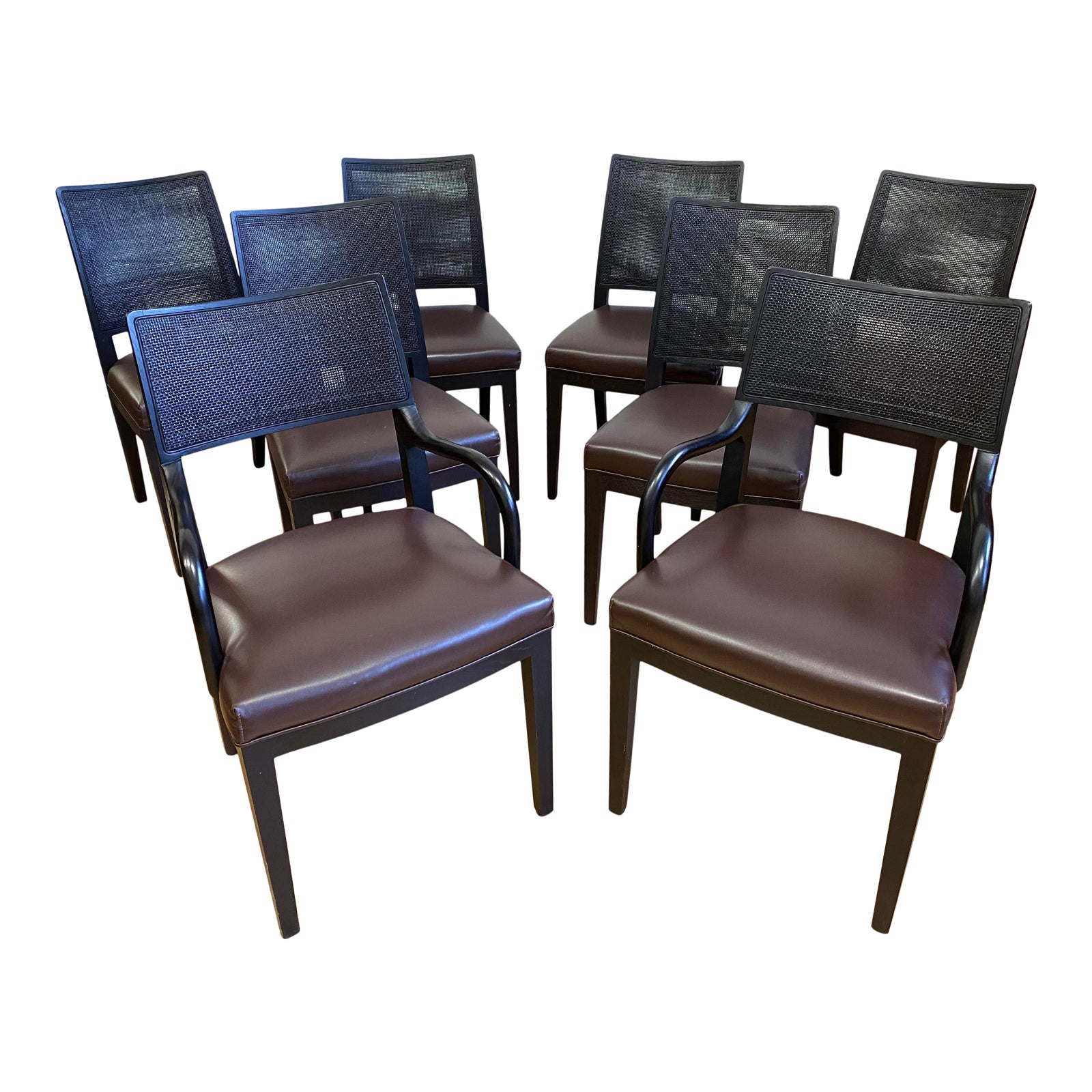 Design Plus Gallery presents a Set of Eight Calipso Chairs. Designed by Antonio Citterio in 2000 fro the Apta Collection, manufactured by Maxalto. The chairs seats are upholstered in a chocolate leather. The frames are a cerused French oak with double-caned seat backing. The arms chairs have curved sleek arms. Minor wear on frames. Consist of six side chairs and two arm chairs. Made in Italy.