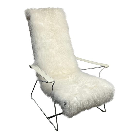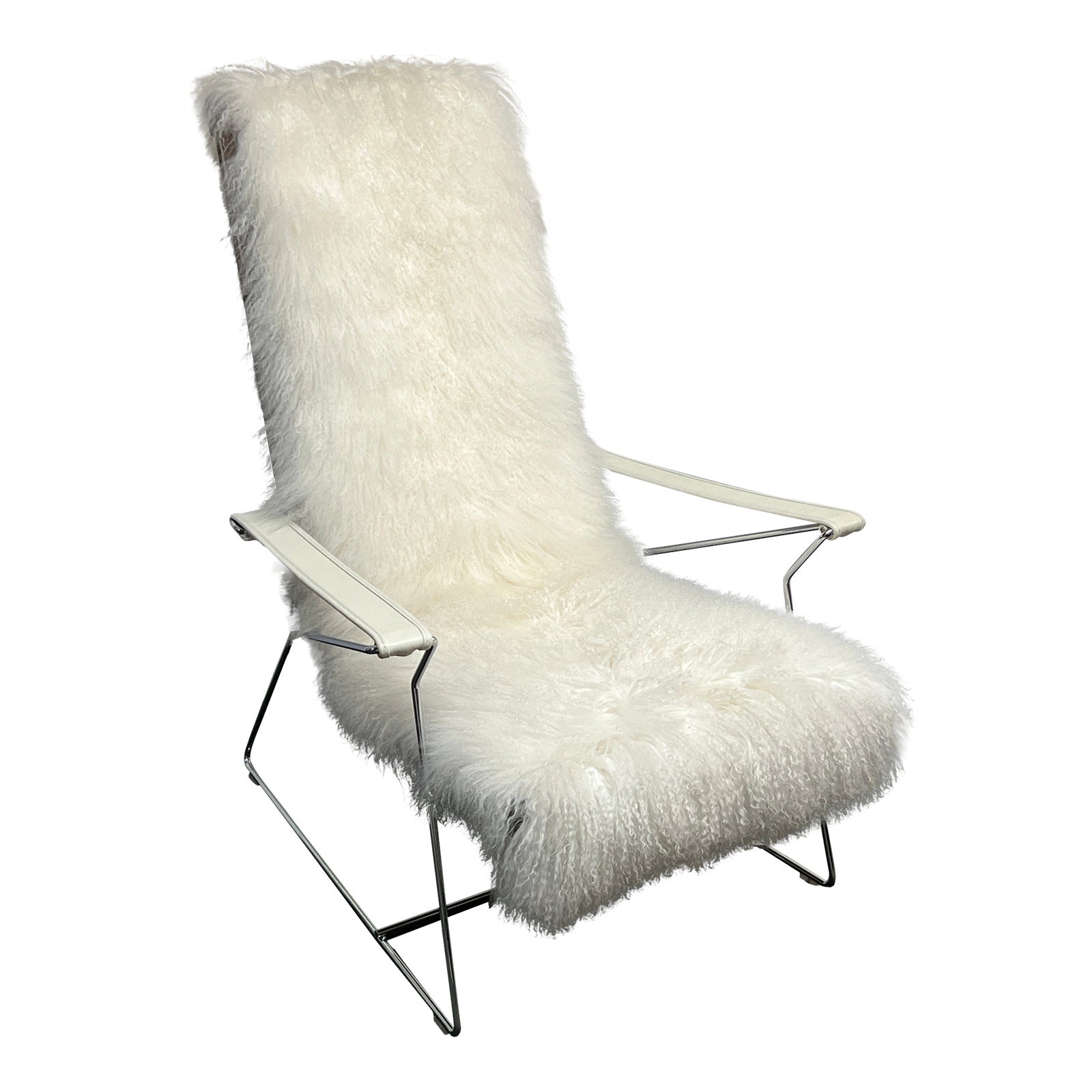 Design Plus Gallery presents the J.J. Italia Armchair made for B & B Italia by Antonio Citterio. The J.J. armchair has a polished chromed steel. Shell in smoked stained oak and webbing in polypropylene in tortora. Its sling back style is completely laid back, with leather wrapped arms in ivory and then the chair is taken to the extreme with a completely fur wrapped body of Mongolian Lambswool. The chair is in good condition, with minimal signs of wear. Made in Italy.