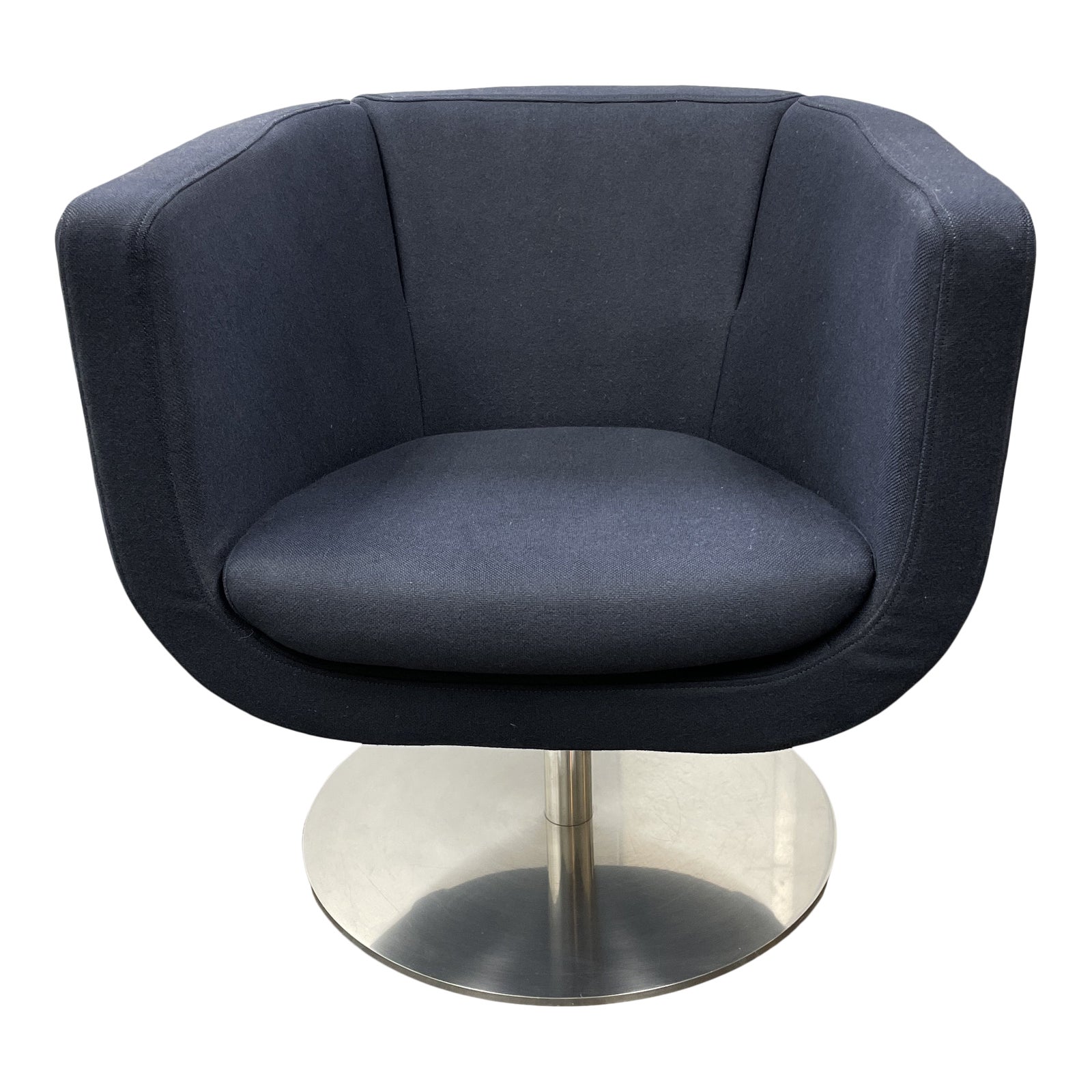 Design Plus Gallery presents a B&B Italia Jeffrey Bernett Tulip Swivel Chair. Designed Jeffrey Bernett in 2006 for B&B Italia. Tubular steel + aluminum base supports the high density polyurethane seat. Originally designed for lounge settings the base is composed of an commercial strength brushed aluminum disc. Small scale and flexibility of the swivel mechanism makes this ideal for floating between areas of interest and interaction with multiple point of interest and function. A slipcover polyester wool blend fabric is in the color navy . Minor wear, good condition. Made in Italy.