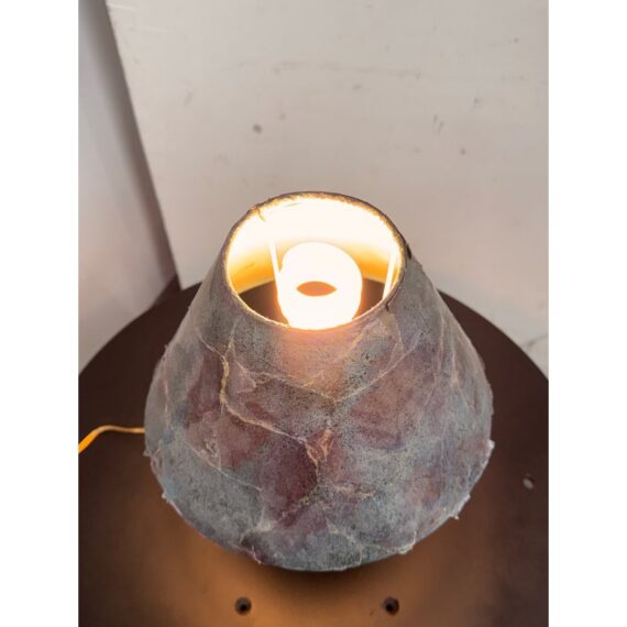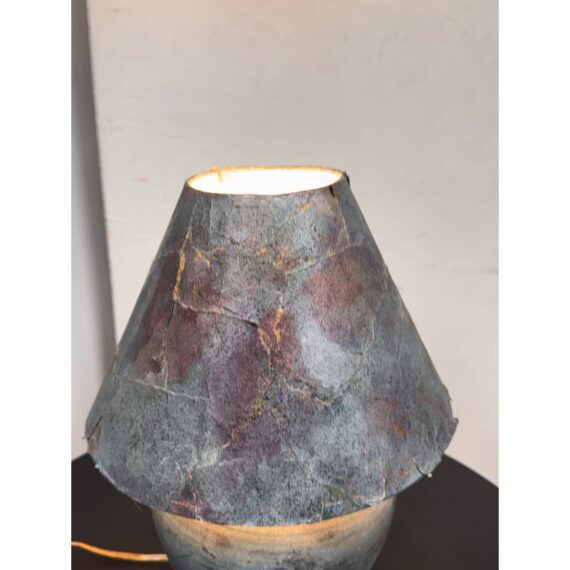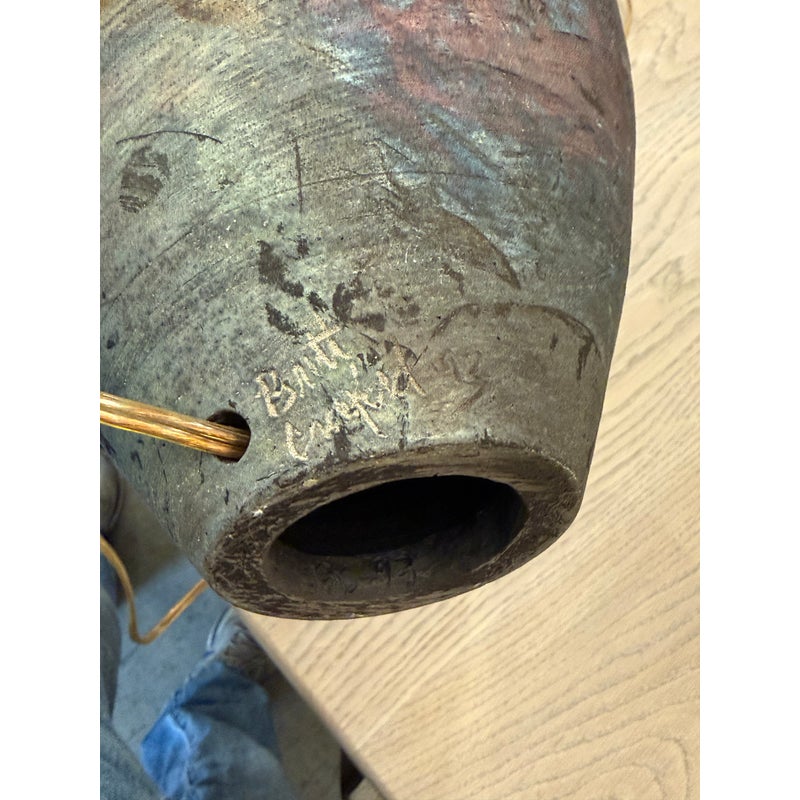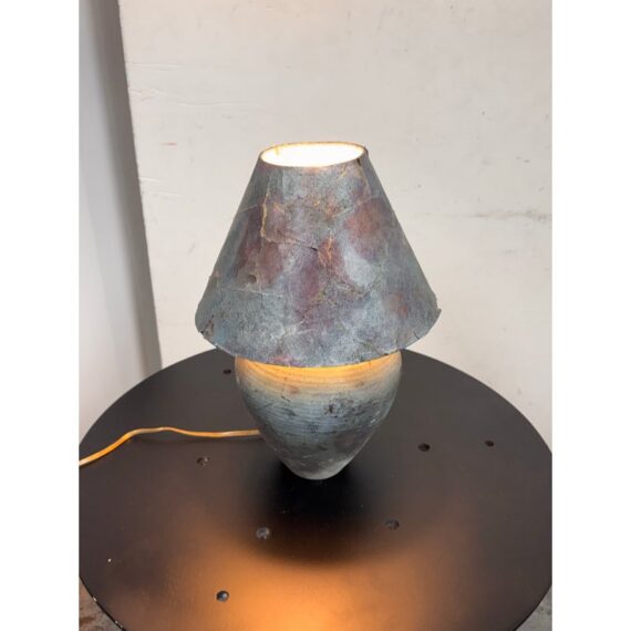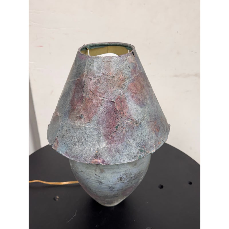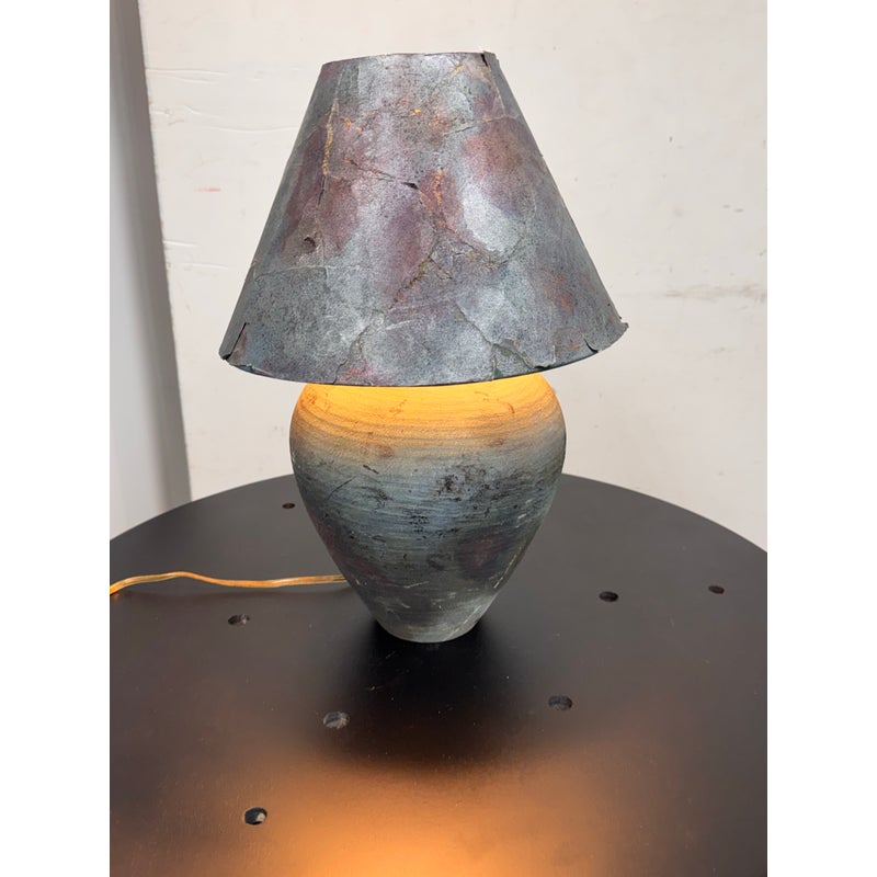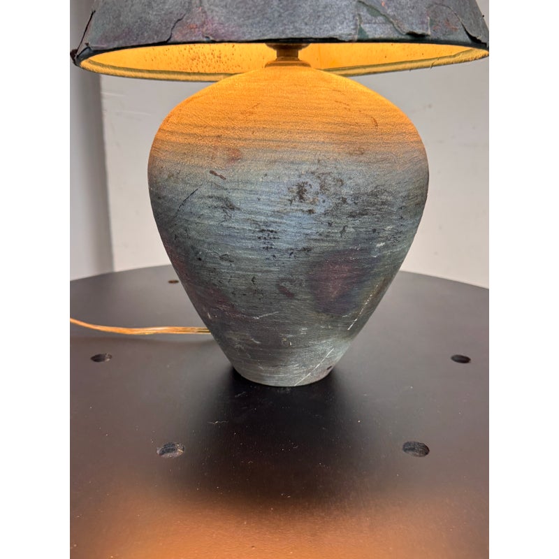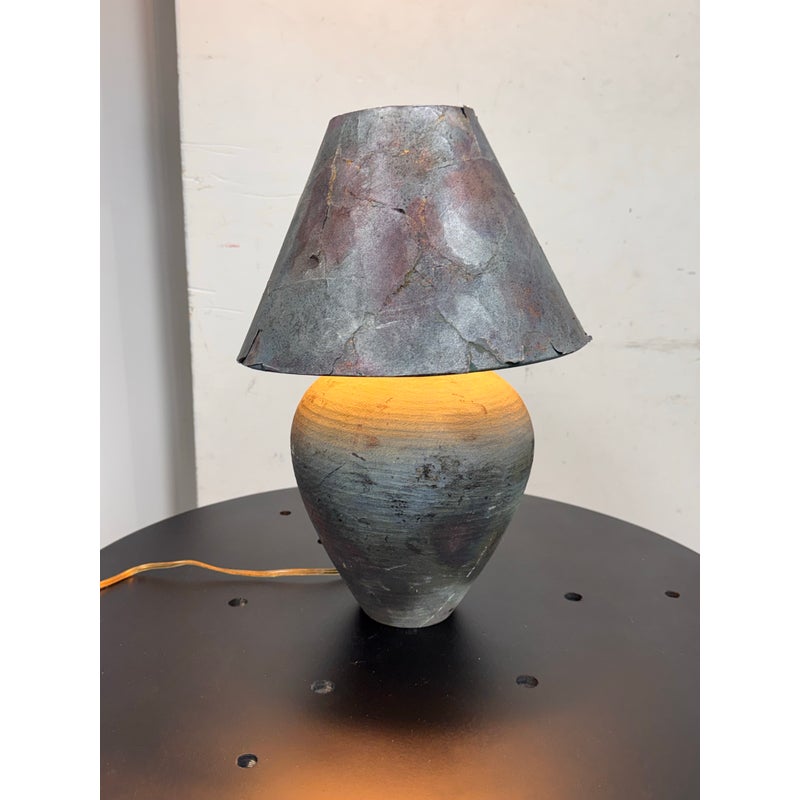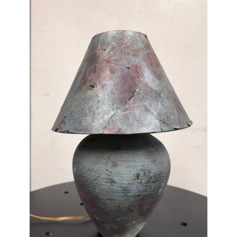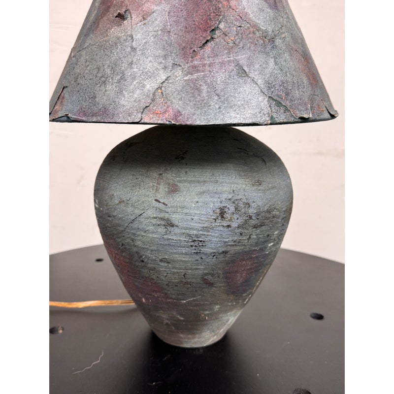 Design Plus Gallery presents a Handcrafted Raku Pottery Table Lamp. This ceramic lamp is defined by the raku firing technique, which gives each piece an individual surface with metallic tones, crackled texture, and subtle iridescence. The vase has a matching conical shade that shows distinctive character of naked raku with copper matte glaze effects. Variations in tone, texture, and pattern emphasize the singular quality of the piece and highlight its hand formed ceramic construction. Signed BCW at base. It is in good condition with visible wear on the shade and minimal wear from usage.