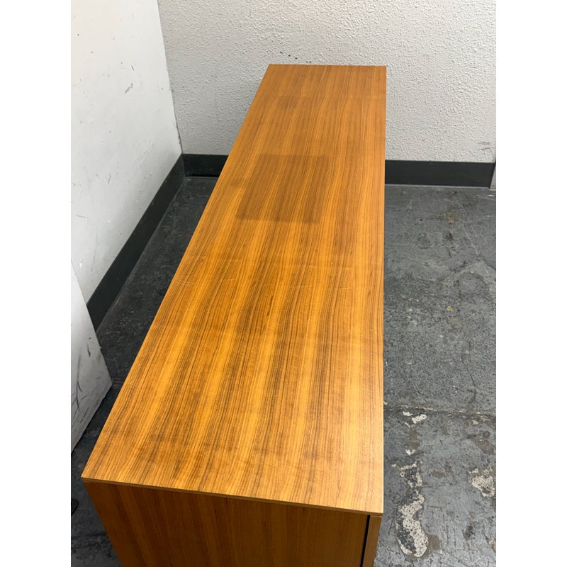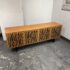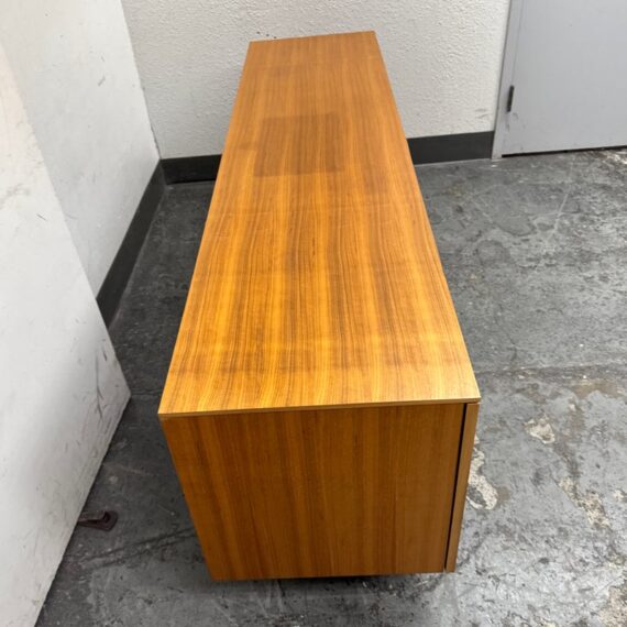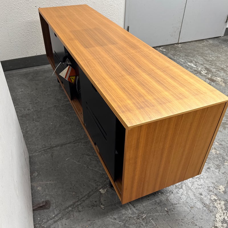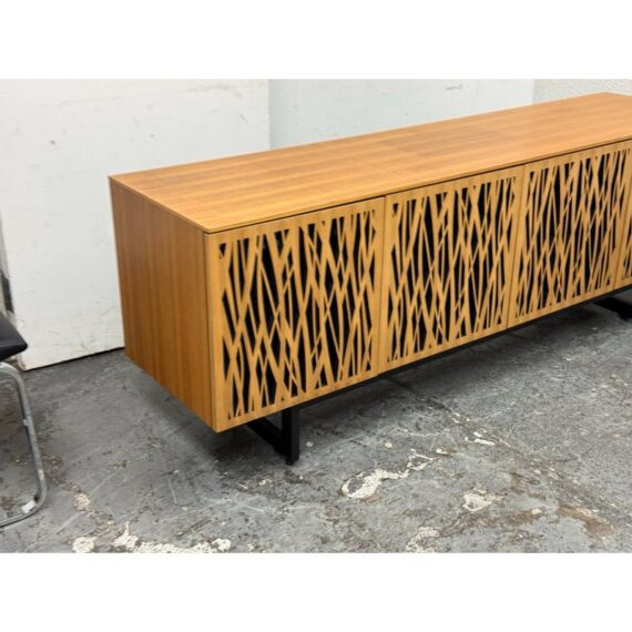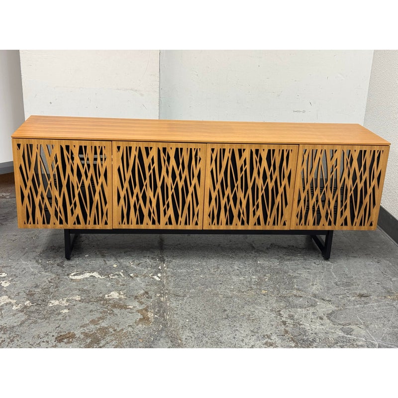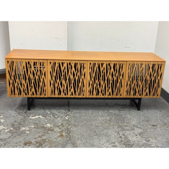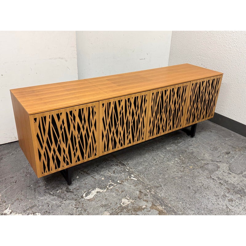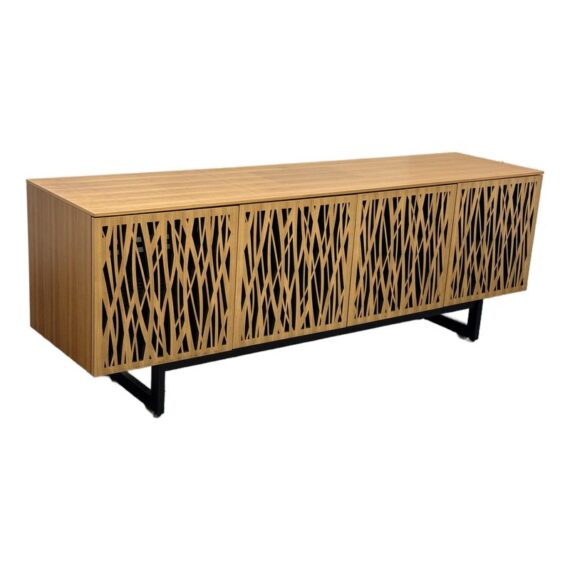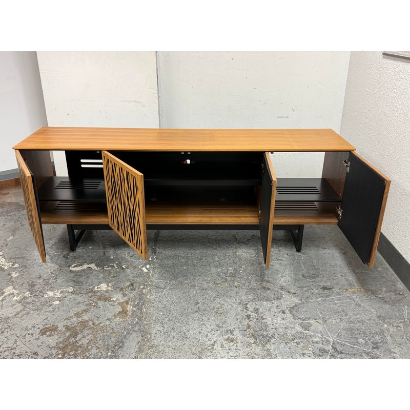 Design Plus Gallery presents an Elements 8779 Quad Cabinet from BDI Elements. Finished in elegant walnut, this piece features a “wheat” design door front, intricately laser-cut to provide a visually interesting pattern that also ensures complete compatibility with your media needs. Behind its beautiful facade, this modern TV stand and media cabinet hides a wealth of innovative home theater features. The remote-friendly doors offer full acoustic transparency, allowing clear transmission of sound from a soundbar or center channel speaker while keeping your AV components concealed. Designed with the needs of the modern home in mind, it includes rear access panels, flow-through ventilation for optimal air circulation, and adjustable shelves for customizable storage. The built-in wire management system keeps connections and cables orderly and easily accessible. The walnut finish offers rich warmth and style, though it does show visible discoloration in areas exposed to sunlight, characteristic for this piece’s age and prior use. This version of the Elements collection is no longer produced, making it a unique find for those seeking a combination of cutting-edge media cabinet design and contemporary visual flair. In good condition, visible discoloration and scratches and minimal wear from usage.