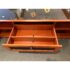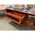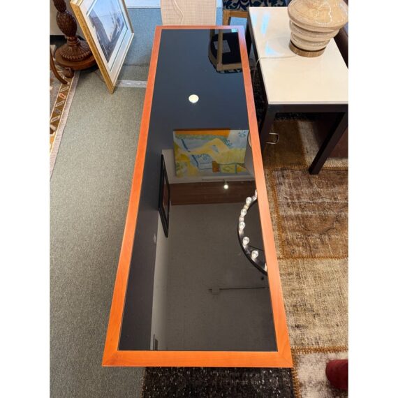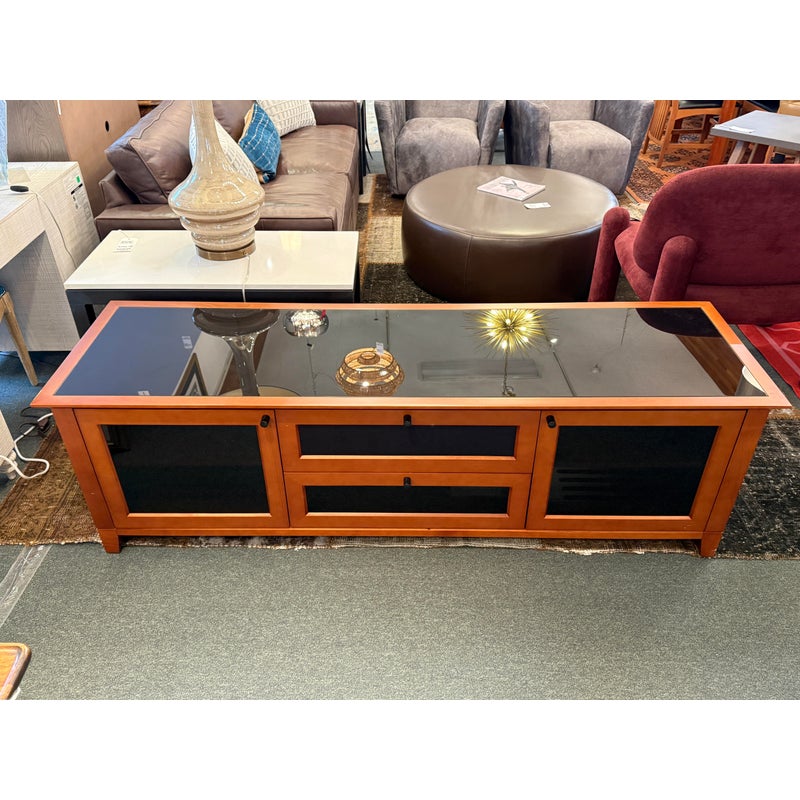 Design Plus Gallery presents the Novia Media Credenza by BDI. Novia is a three-compartment home theater cabinet designed to accommodate a large television and home theater system. Its transitional design incorporates unique features such as concealed wheels for effortless cabinet movement, cable management to maintain a tidy and organized home theater environment, and integrated ventilation to optimize component performance. The top mesh front drawer provides concealed storage for a speaker (up to 7 inches tall). Black glass panels enhance the visual appeal of the rich cherry-finished wood cabinet. Light surface wear; condition is good for age and use.