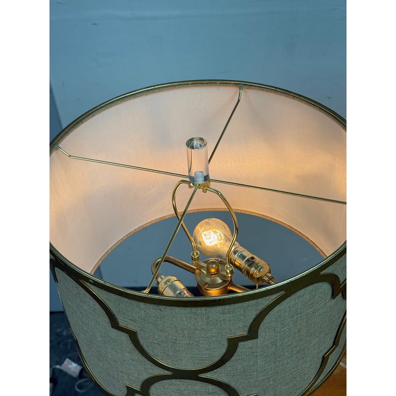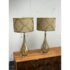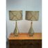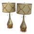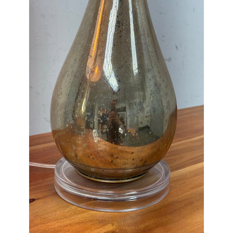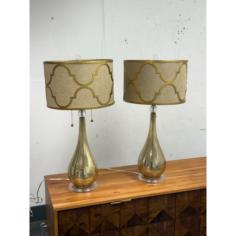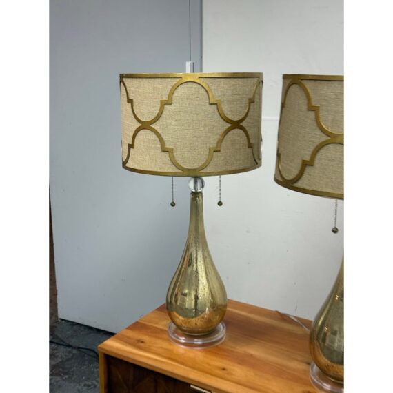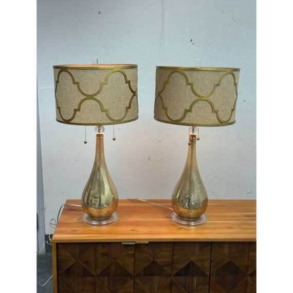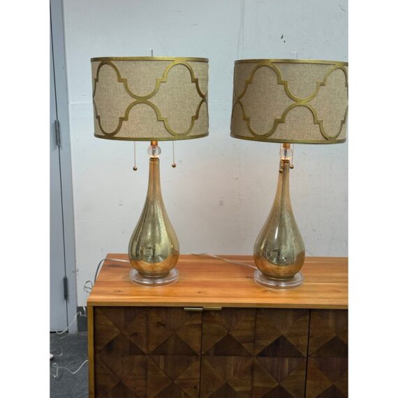 Design Plus Gallery presents a Pair of Westly Glass Table Lamps from Becky Fletcher. Each lamp has a handcrafted mercury glass teardrop base that shimmers with a metallic glow. The unique linen barrel shade is enhanced with a decorative gold metal overlay and acrylic accents. The lamps are not only functional but also serve as artistic statements. Their versatile design complements a wide variety of interior styles. Whether placed on bedside tables, consoles, or sideboards, the Westly Glass Table Lamps bring quality, style, and a warm ambiance to your space. In good condition, visible and minimal wear from usage.