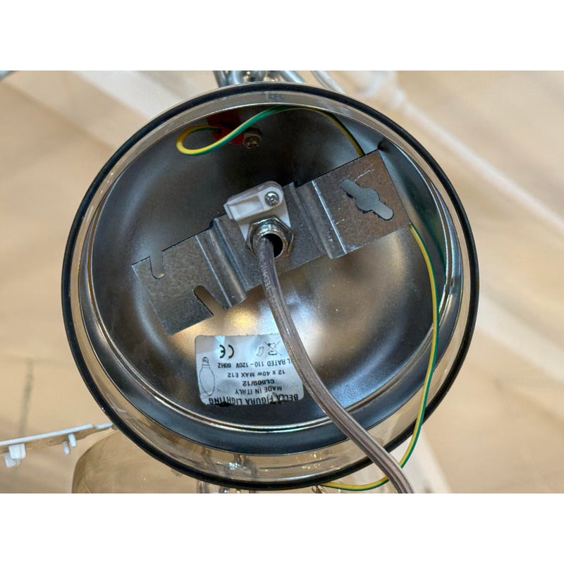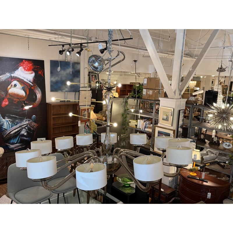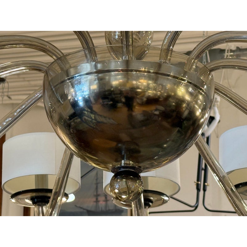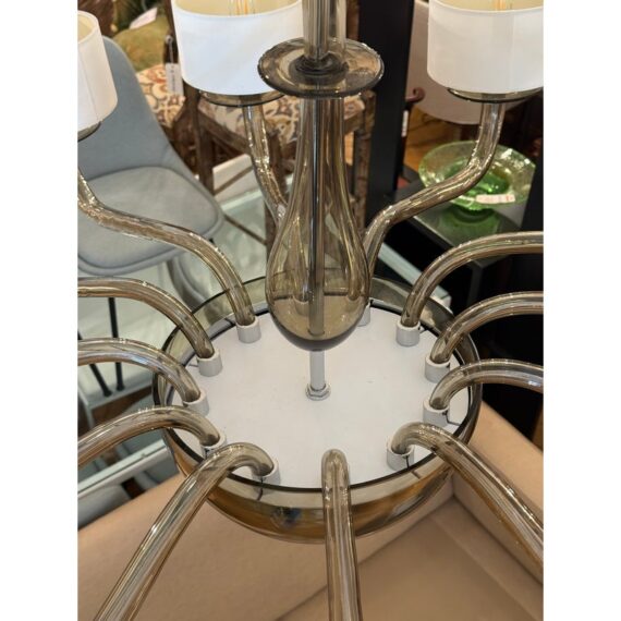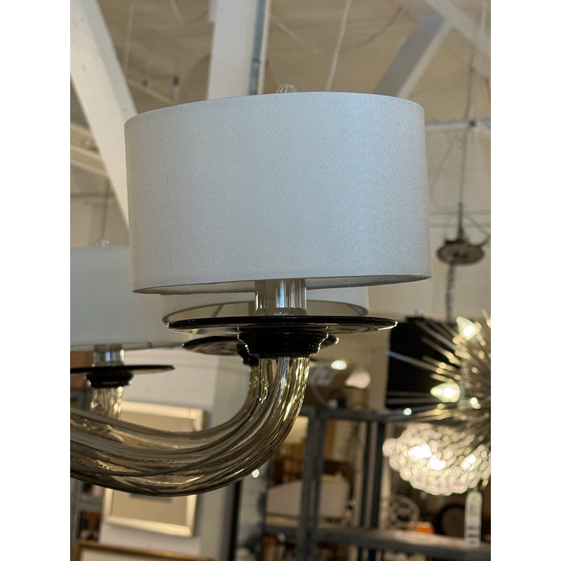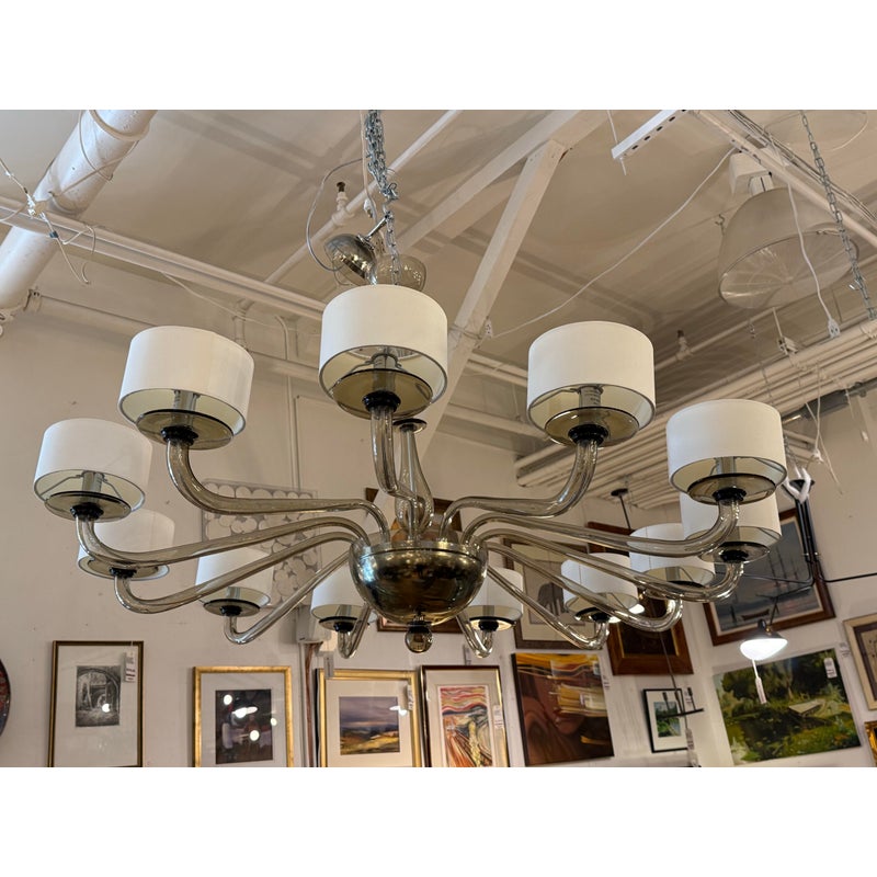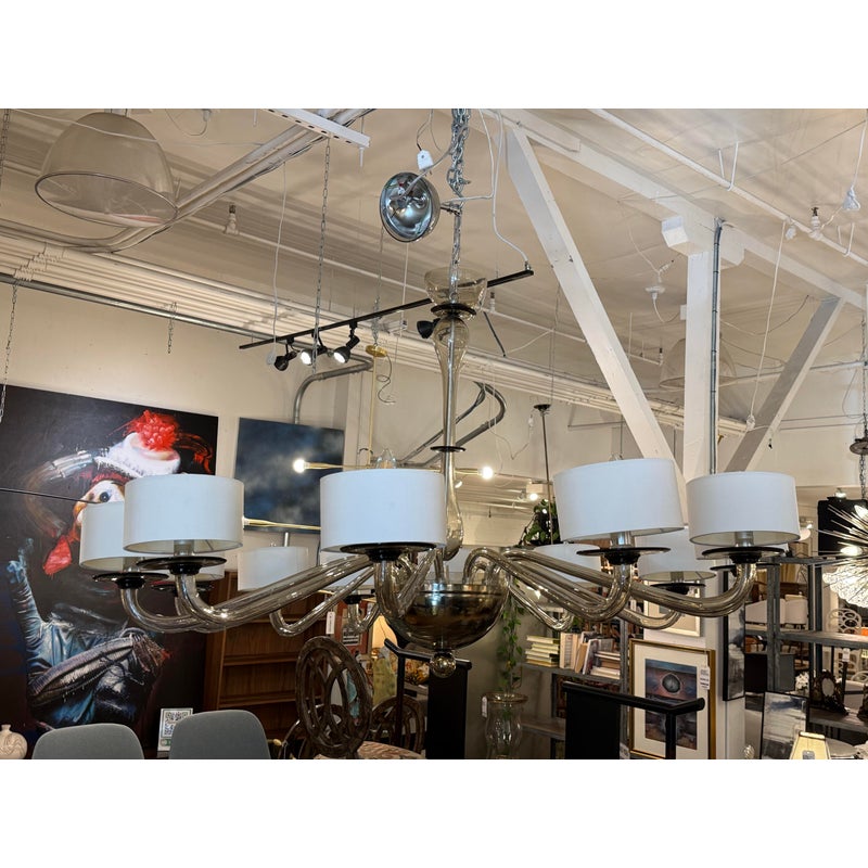 Design Plus Gallery presents the Disc Chandelier from Bella Figura. The Disc Chandelier is part of the Venetian Glass collection that is celebrated for elegance, balance, and timeless simplicity, The chandelier offers twelve gracefully curved arms formed from grey Murano glass that are held by polished chrome accents to enhance its sculptural presence. Each arm is topped with a short drum shade, softly diffusing light to create a warm, ambient glow while maintaining a clean, architectural look. The fluid glass forms and restrained palette allow the chandelier to feel both luxurious and understated, striking yet effortless. It is in good condition, with minimal wear. and one of the twelve lights needs rewiring. Made in Italy.