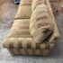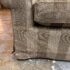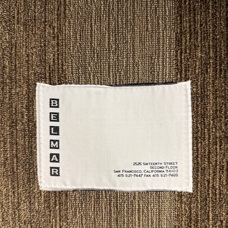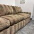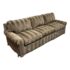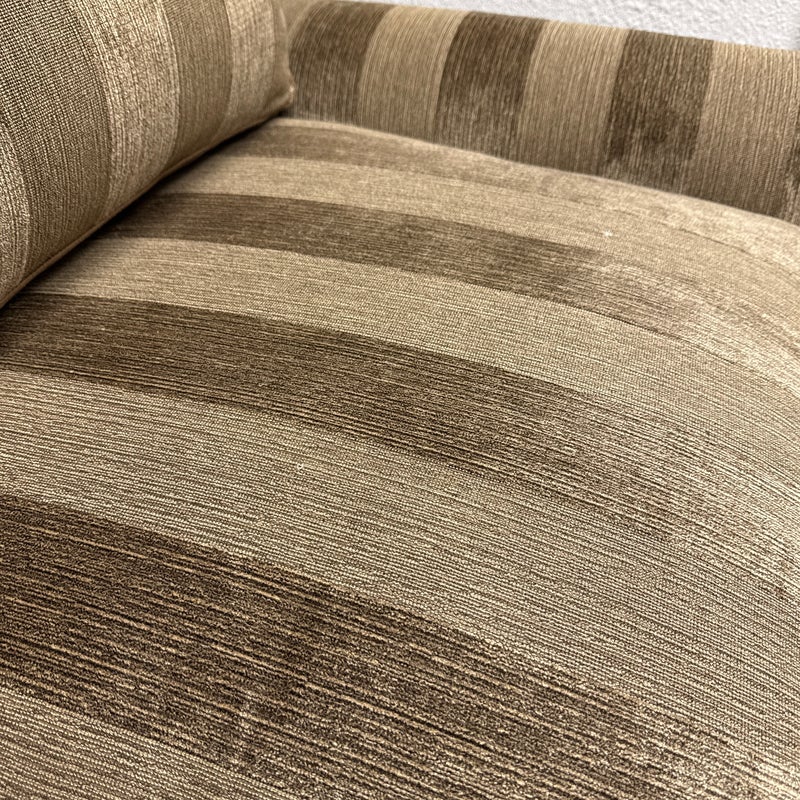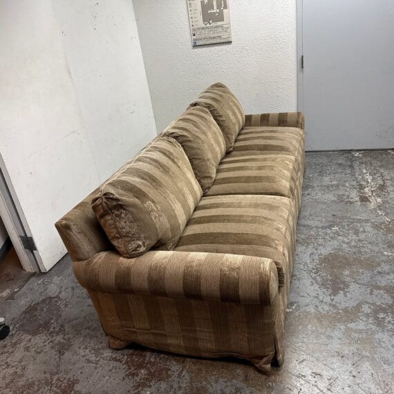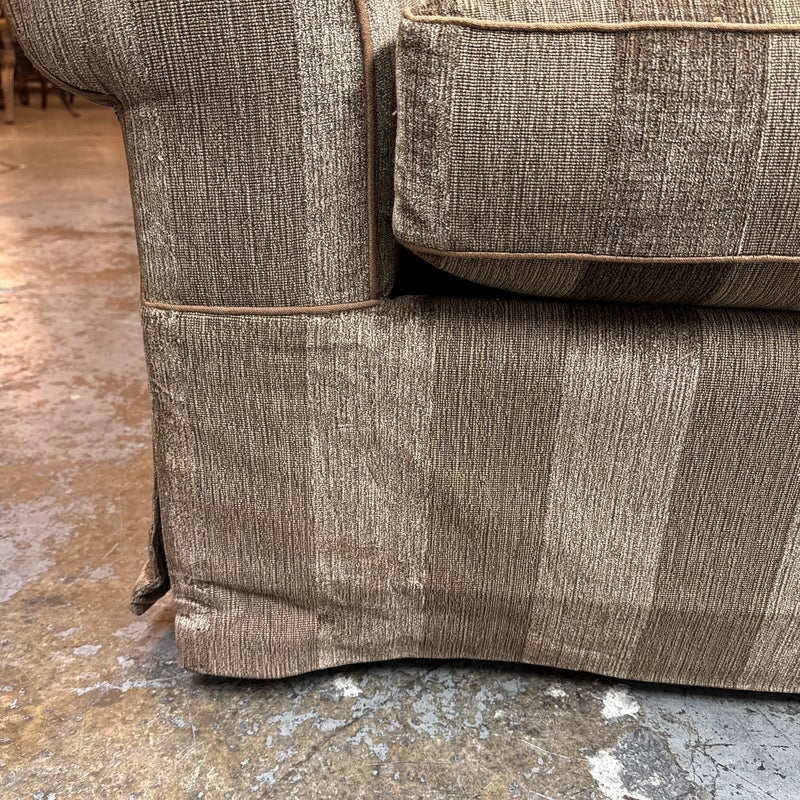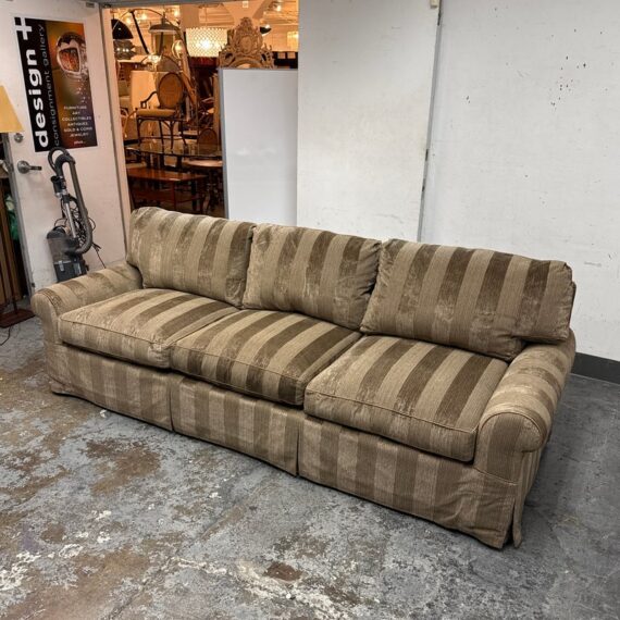 Design Plus Gallery presents a Bespoke Rolled Arm Sofa from Belmar Furniture. This three-seat sofa is upholstered in taupe and brown striped chenille-style fabric with rolled arms, welted cushion edges, loose back cushions, three seat cushions, and a skirted base. The Belmar maker’s label is present beneath the cushioning. The upholstery shows tonal variation, light wrinkling. It is in good condition with visible markings on fabric cushion and skirt and minimal wear from usage. Made in San Francisco, California, USA.