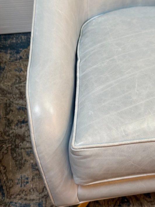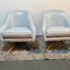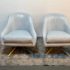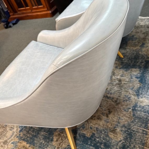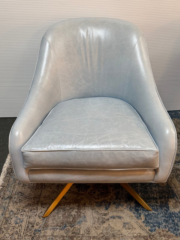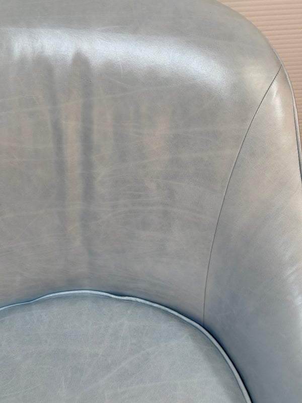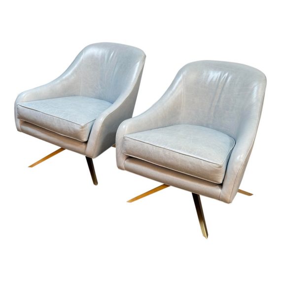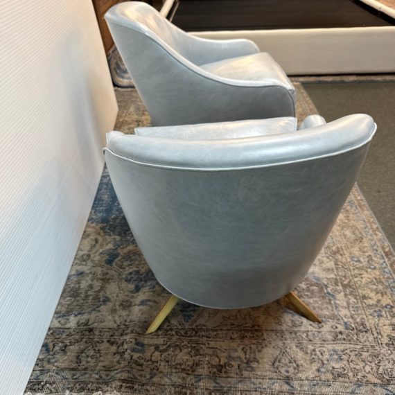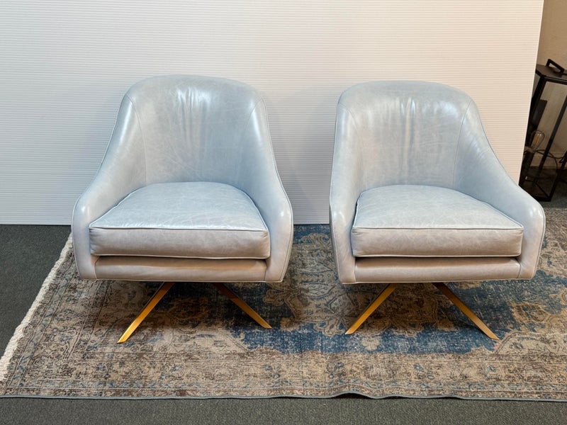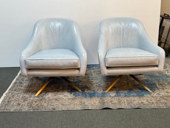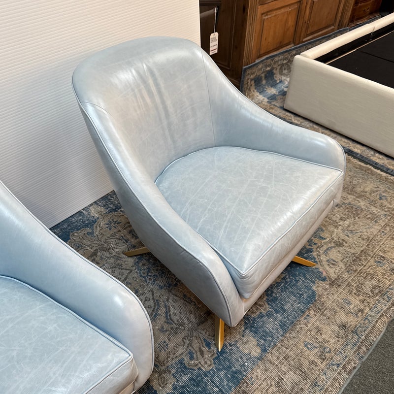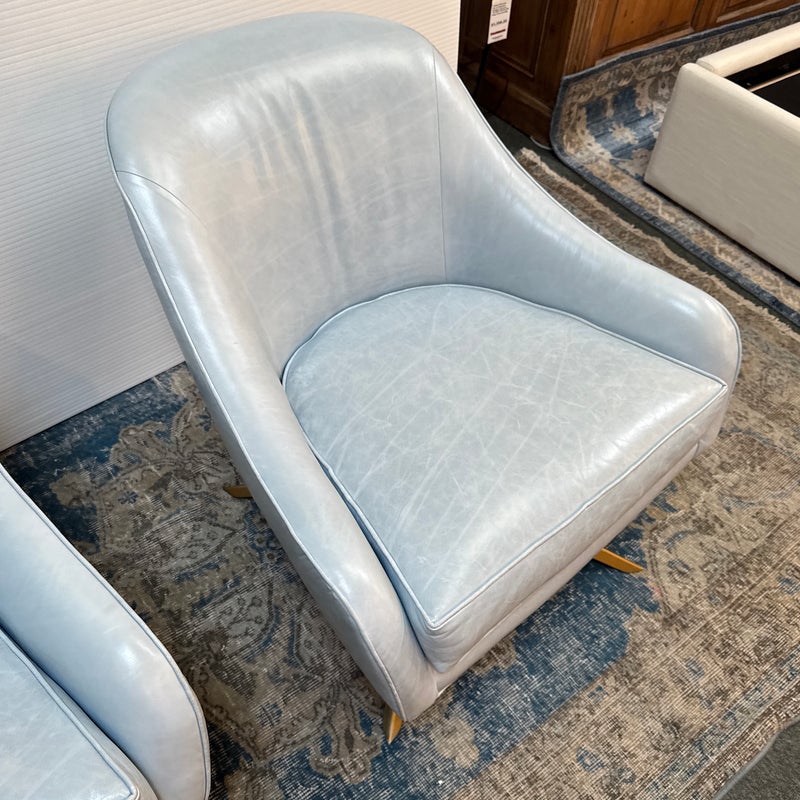 Design Plus Gallery presents a Pair of Leather Matador Swivel Chairs. Of the Mid-20th Century Style, the two chairs have been refreshed in a wonderful light blue leather upholstery. Reupholstered by Belmar Upholstery, San Francisco, California, USA. The quality and care shows wholly with the chairs. In good condition, visible distress and minimal wear from usage + age.