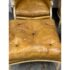 Design Plus Gallery presents a Pair of Custom Hendrix Allardyce Louis XVI Style Bergere Armchairs + Ottomans by Belmar Furniture. A distinguished touch of French elegance to any interior. Expertly constructed from solid woods, this set displays a timeless silhouette marked by graceful curves, delicate carvings, and a refined, light wood finish that highlights the beauty of the frame. Upholstered in genuine, aged natural distressed cognac leather, lending them a rich patina and warm, inviting character. The supple leather is gently worn in all the right places, with visible yet minimal signs of wear that add to the authentic vintage appeal of the set. The interior cushioning ensures comfortable seating, while the supportive arms and seat make this an ideal spot for reading or lounging in style. Accompanied by a four point star shape tufted ottoman. Perfect for any space. In good condition, visible and minimal wear. Crafted in San Francisco, California, USA.