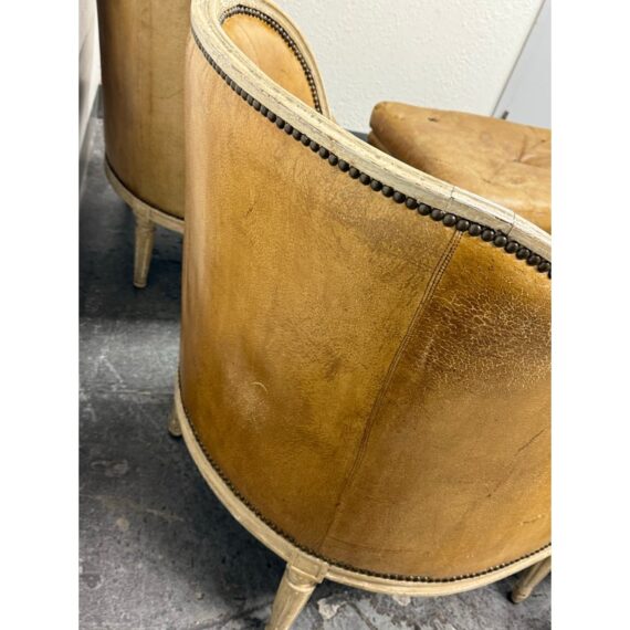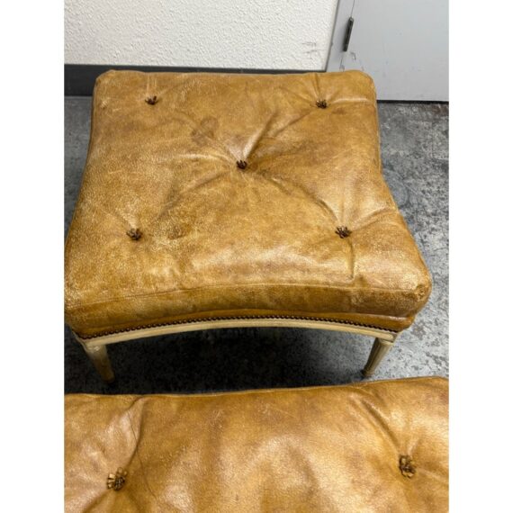Design Plus Gallery presents a Pair of Custom Hendrix Allardyce Louis XVI Style Bergere Armchairs + Ottomans by Belmar Furniture. A distinguished touch of French elegance to any interior. Expertly constructed from solid woods, this set displays a timeless silhouette marked by graceful curves, delicate carvings, and a refined, light wood finish that highlights the beauty of the frame. Upholstered in genuine, aged natural distressed cognac leather, lending them a rich patina and warm, inviting character. The supple leather is gently worn in all the right places, with visible yet minimal signs of wear that add to the authentic vintage appeal of the set. The interior cushioning ensures comfortable seating, while the supportive arms and seat make this an ideal spot for reading or lounging in style. Accompanied by a four point star shape tufted ottoman. Perfect for any space. In good condition, visible and minimal wear. Crafted in San Francisco, California, USA.
