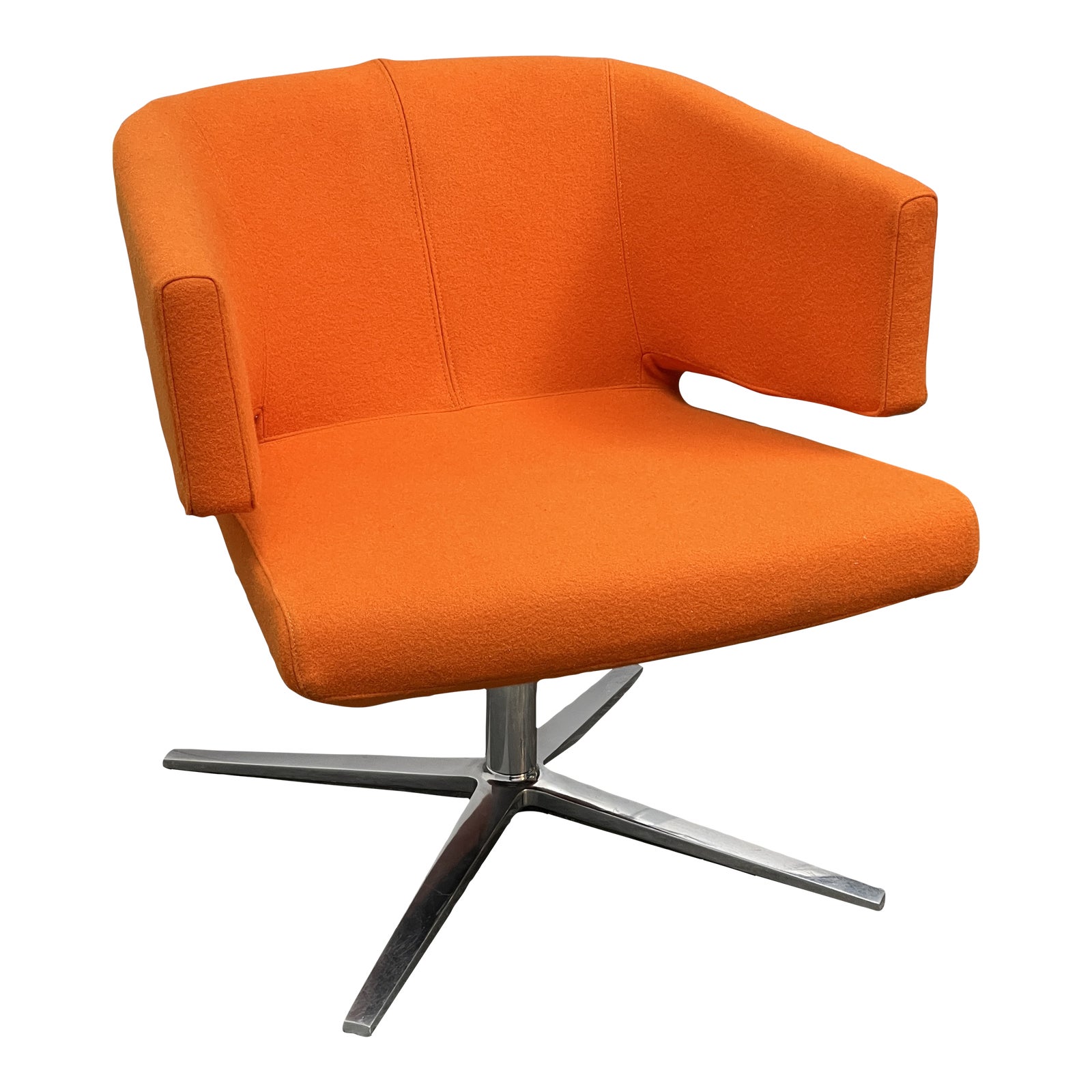 Design Plus Gallery presents a Lotus Lounge Chair in Gaga Orange Wool by BenSen. Like a flower opening, the Lotus lounge chair is beautiful from all angles. The chair swivels on a steel base to allow maximum flexibility. Lotus is a multi-purpose lounge chair equally appropriate for residential or commercial spaces. Wear is shown on the arm especially, generally this is in good condition with wear that is consistent with age and usage.