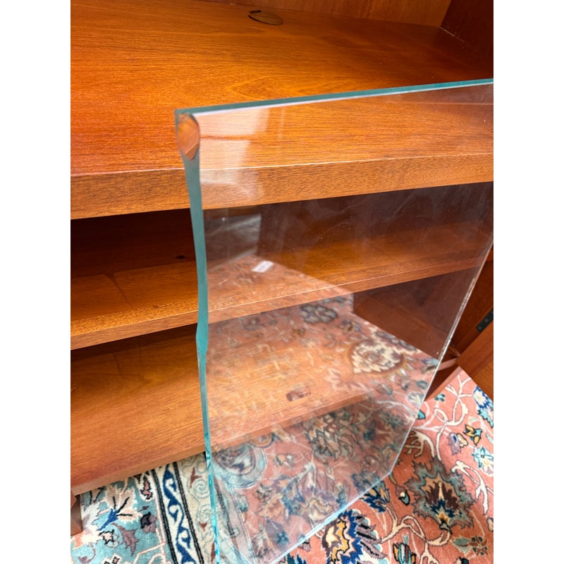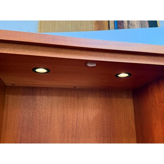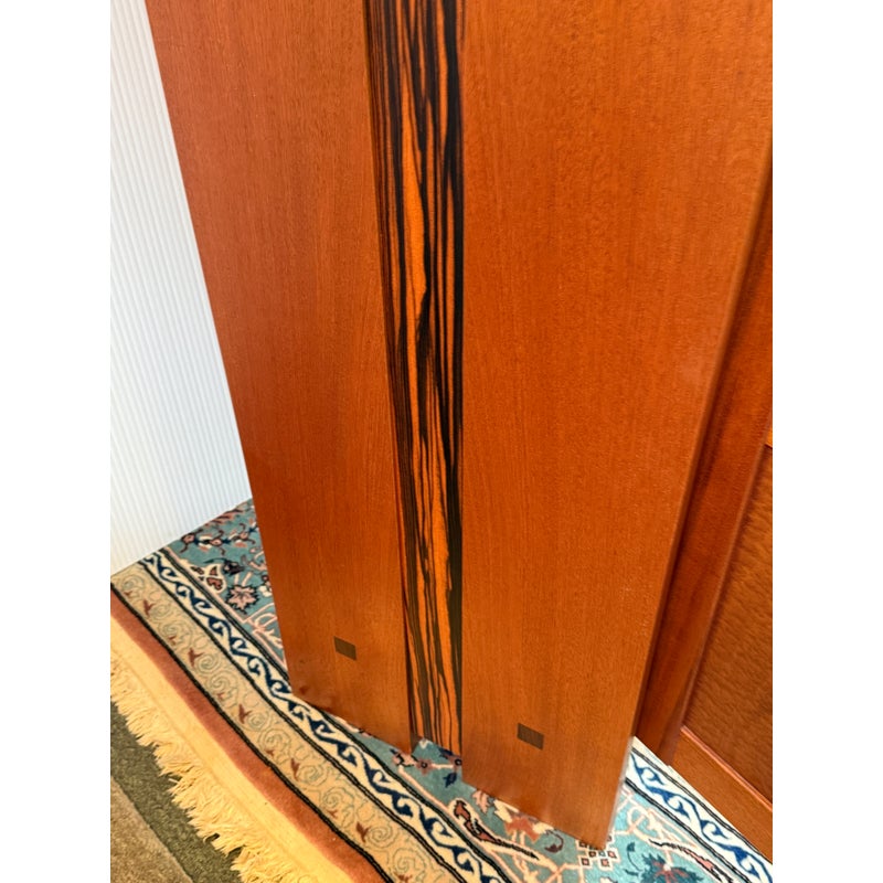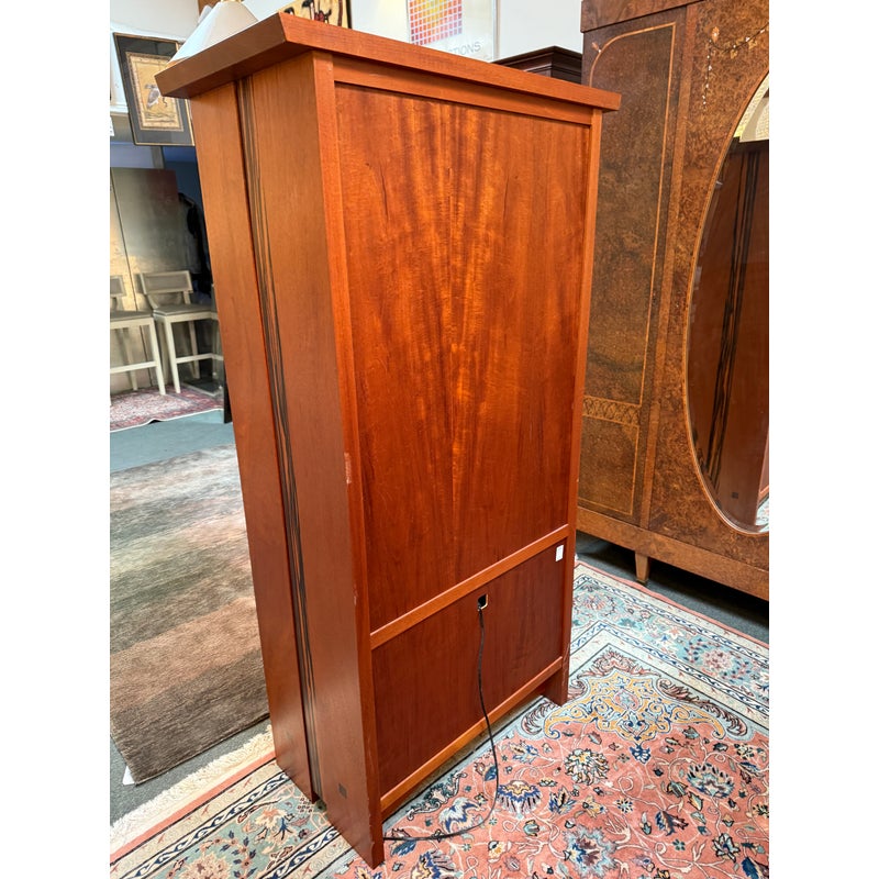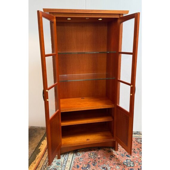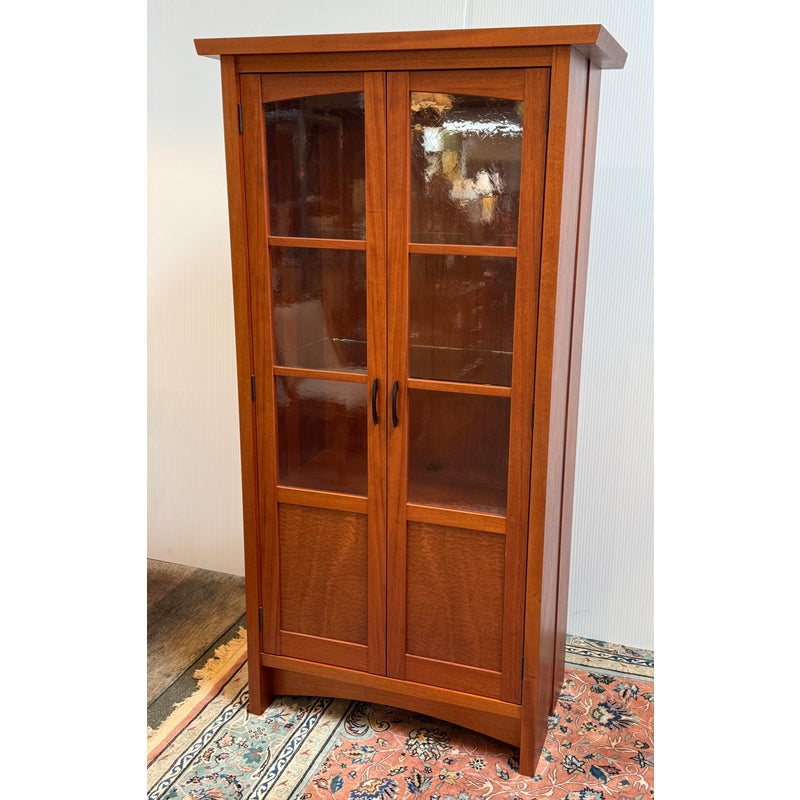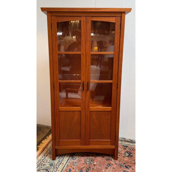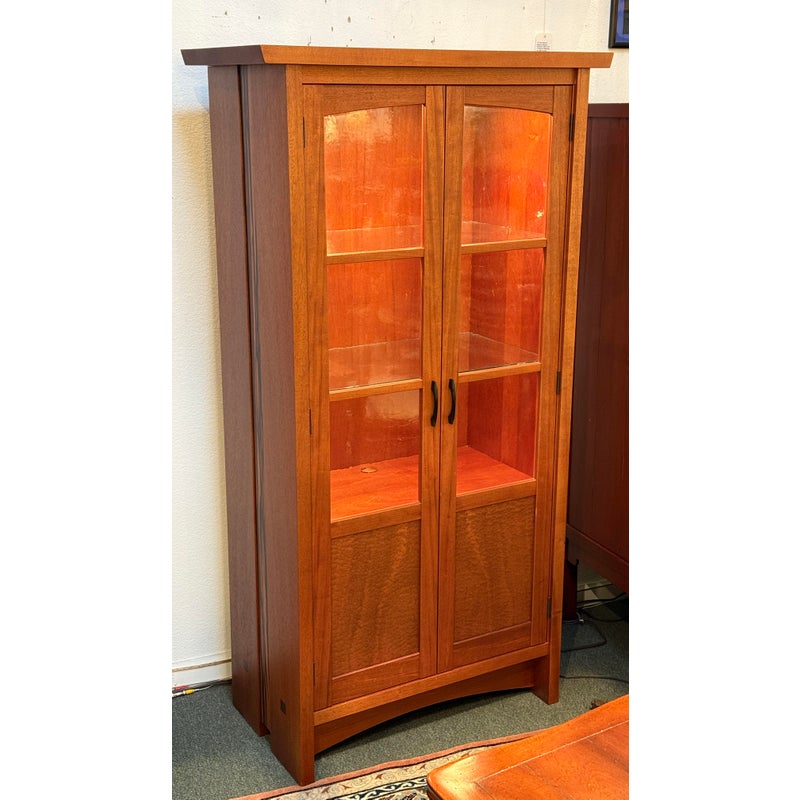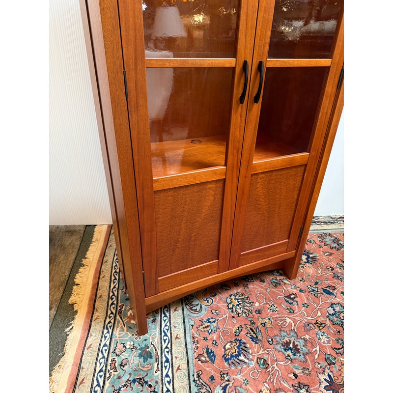 Design Plus Gallery presents a Berkeley Mills “Mesa” Custom Mahogany Display Cabinet. Handcrafted in mahogany with Arts & Crafts details. The two full-length glass doors open to adjustable glass shelving with three additional wood shelves below. Beautiful wood grain details along sides. Two interior lights. In good condition with minor wear due to use. A chip in glass of one shelf, does not affect performance or stability. In good condition with minimal wear due to age. Made in California, USA.