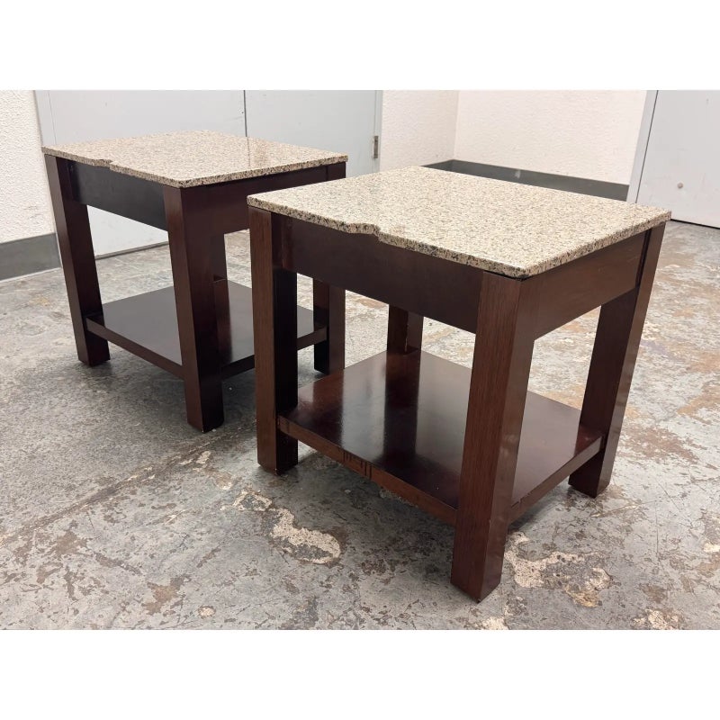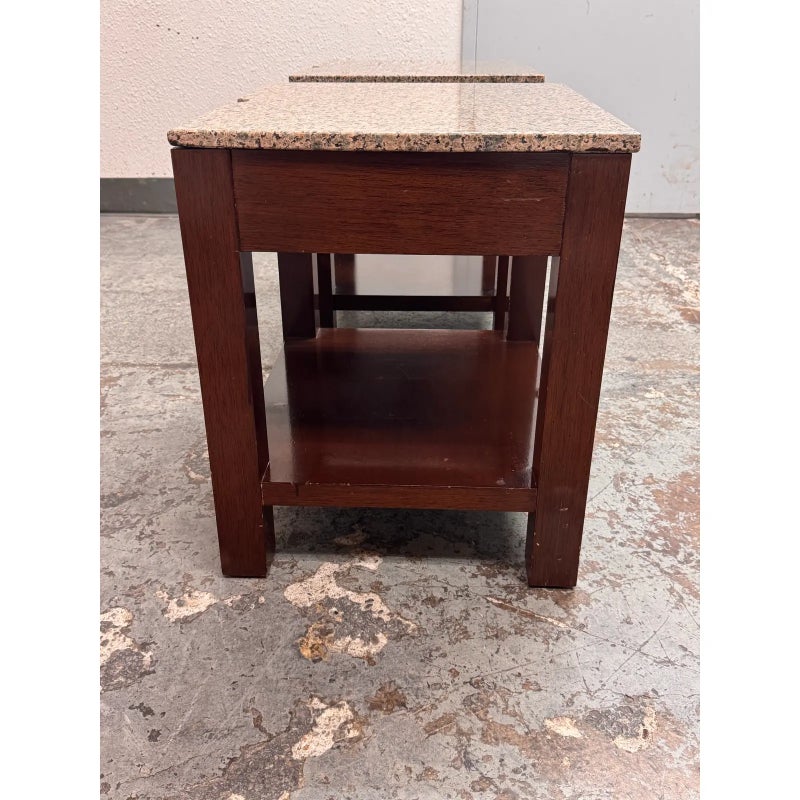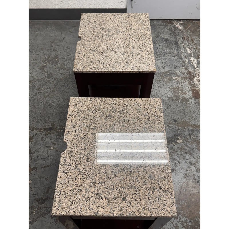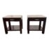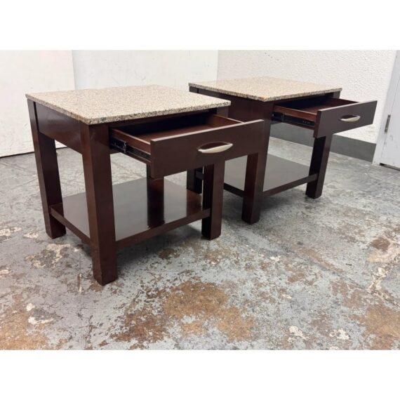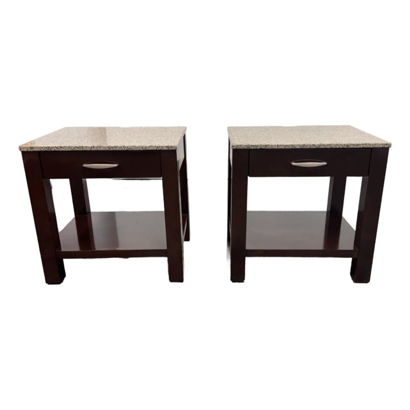 Design Plus Gallery presents a Pair of Bespoke Nightstand by BERMANFALK. The duo are nicely structured and would work well as end tables in a living area as well. They have dark, espresso wooden frames in a square shape. There is a lower shelf with a single drawer below its stone surface. The nightstands are in good condition with scuffs and small signs of wear for their usage. Made in Canada.