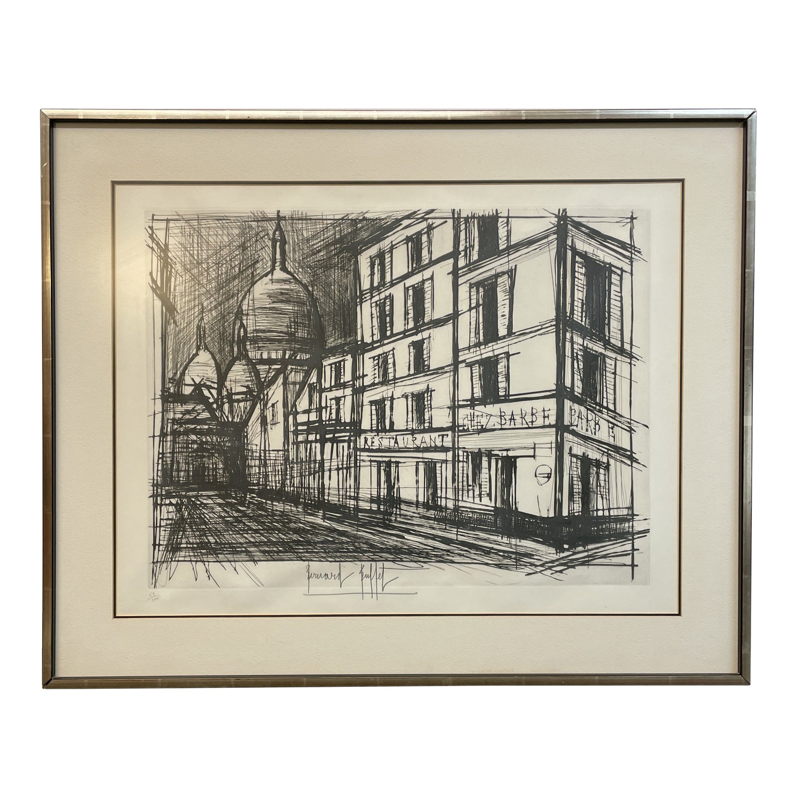 Design Plus Gallery presents a lithographby French artist Bernard Buffet (1928 – 1999), entitled “Restaurant Chez Barbe” circa 1969. The lithograph is signed and numbered 52/100, double matted and framed in slim, metal frame.