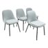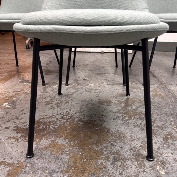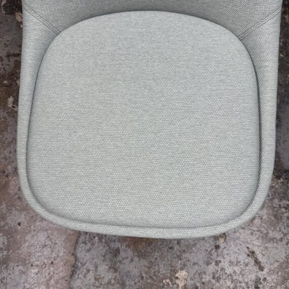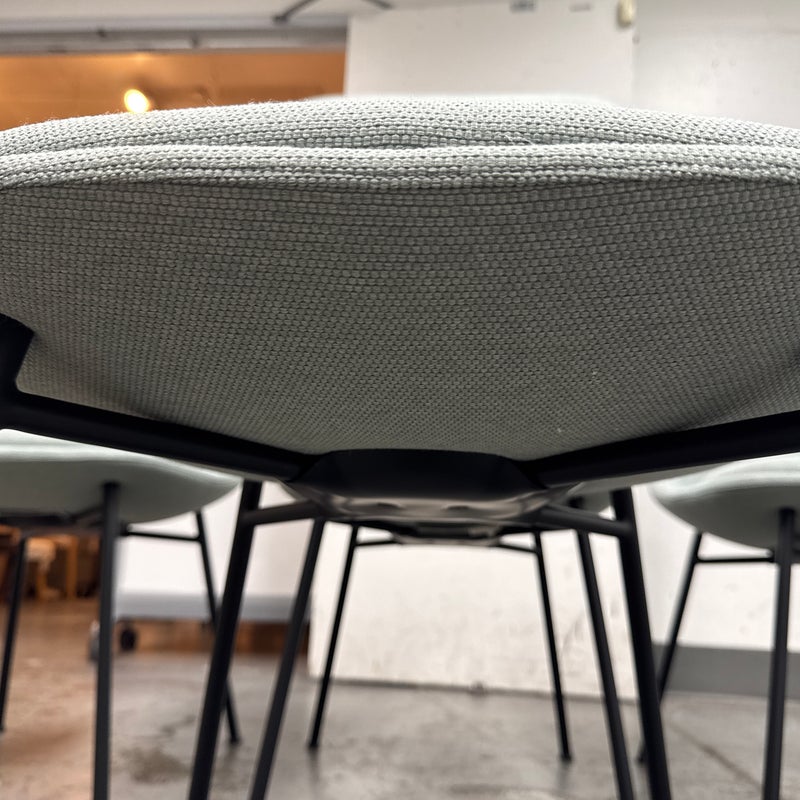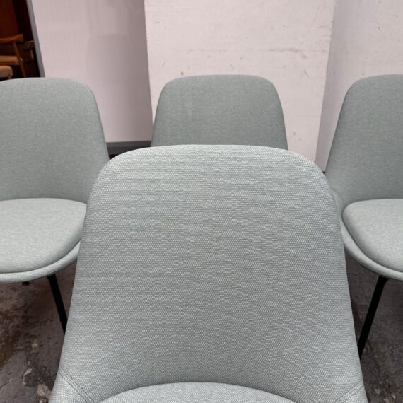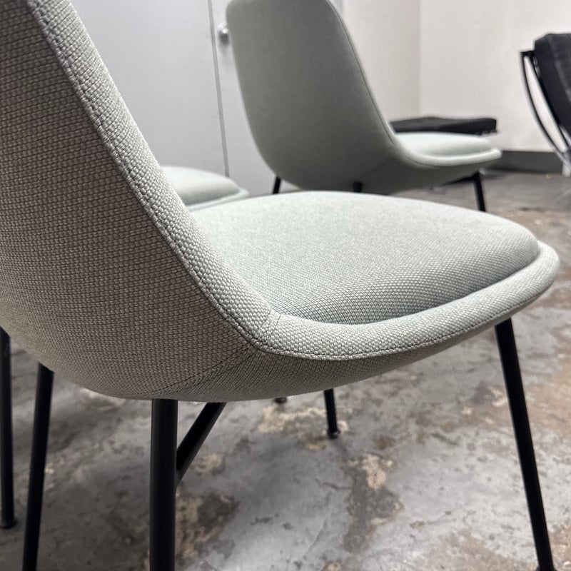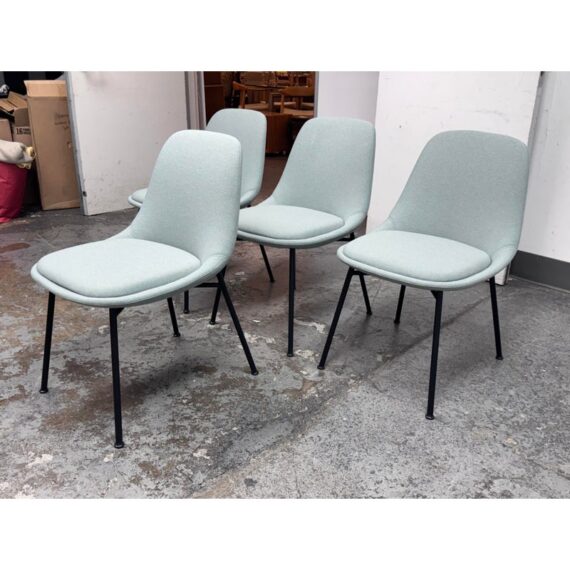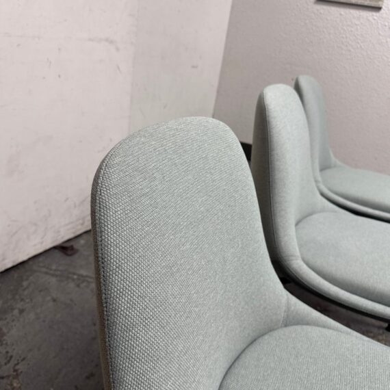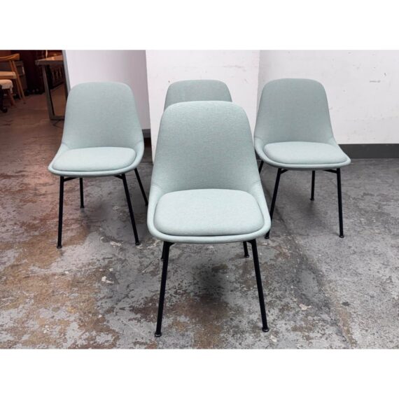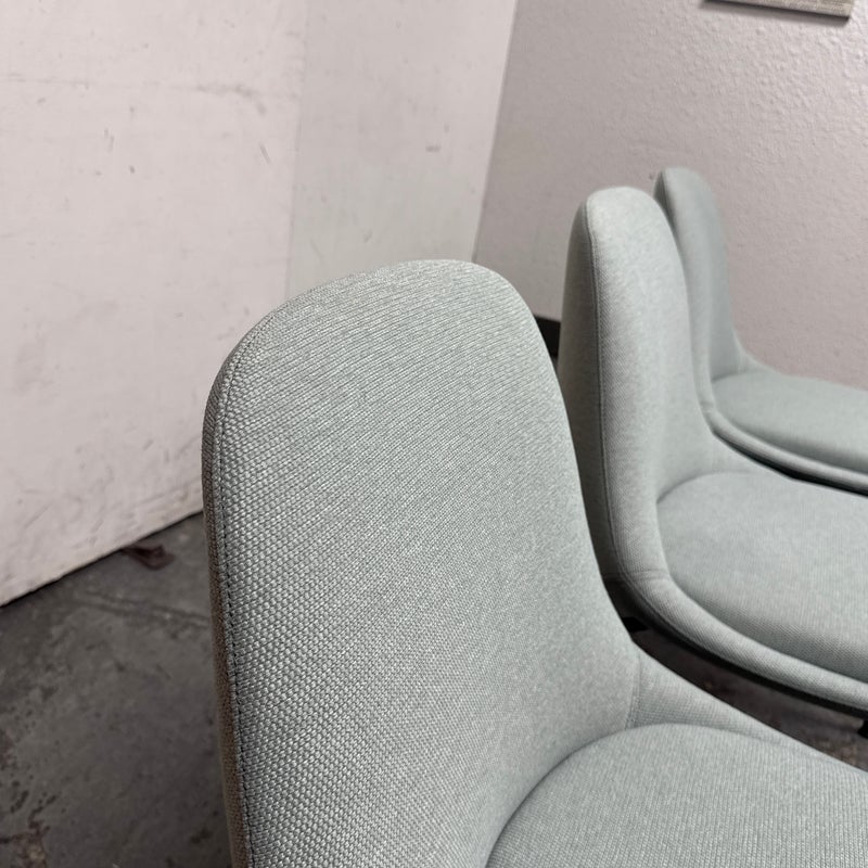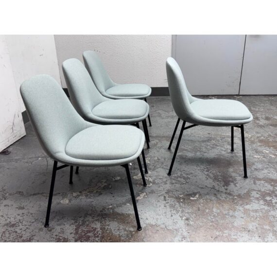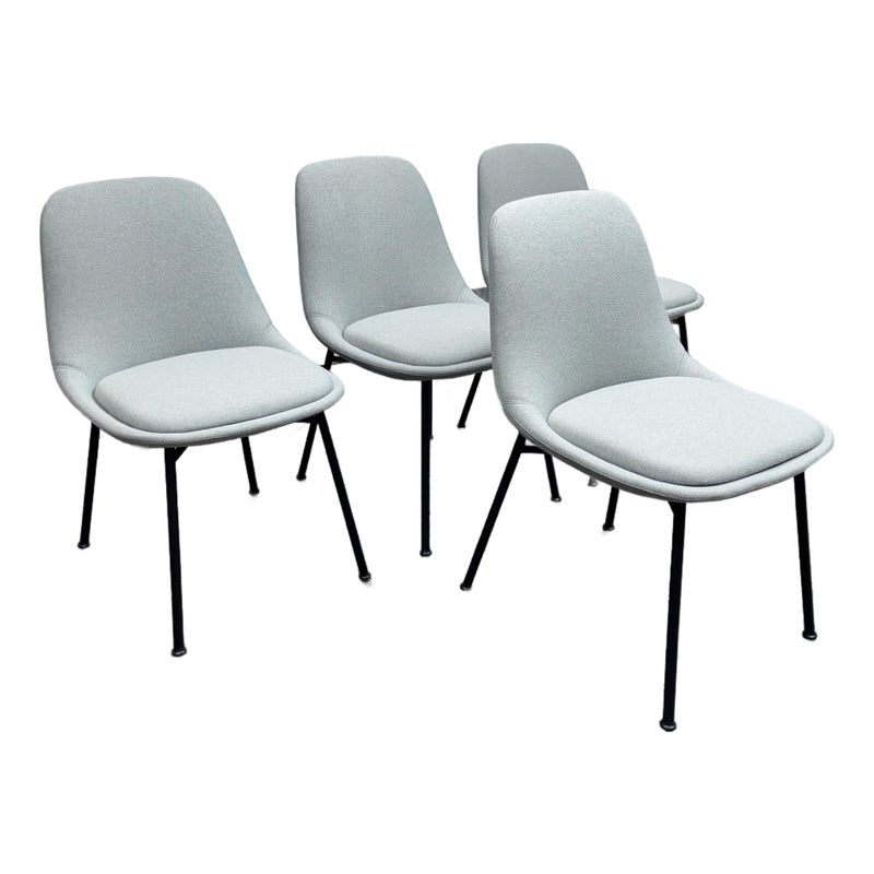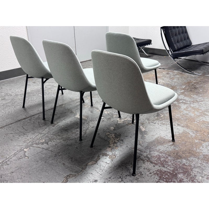 Design Plus Gallery presents a Set of Four Sky Upholstered Chloe Dining Side Chairs from Bernhardt. The Chloe seating collection was created to add gracefully rounded forms to collaborative workspaces and dining rooms. Its seat offers a substantial cushion while maintaining a streamlined look. Chloe also provides remarkable back support as one is enveloped in the curved shell. Successfully merging function and style. They are in showroom like condition with minimal signs of wear for their age. Made in the USA.