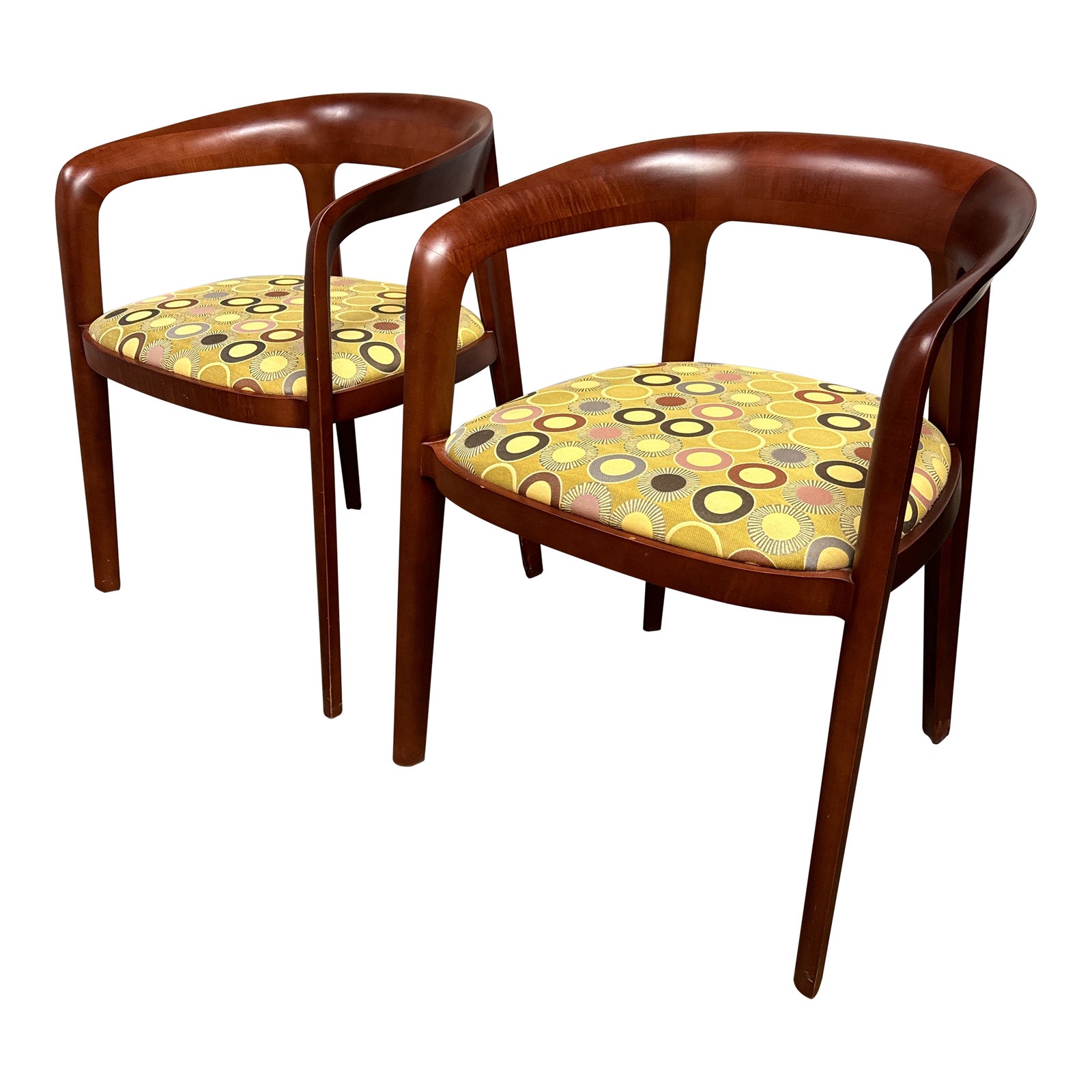 Design Plus Gallery presents a Pair of Solid Wood Corvo Arm Chairs from Bernhardt. The richness of the mahogany finish is great complimented with its curved frame making it an easy chair to lean back into and relax on. The upholstery offers neutral splashes of color in concentric circles of varying sizes layered with a natural silk like luster. In good condition, visible wear on the legs and minor refinish minor will be needed. Made in USA.