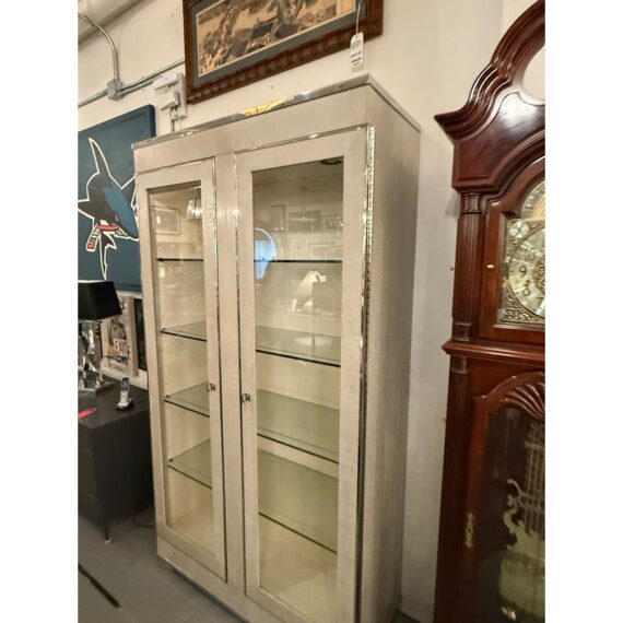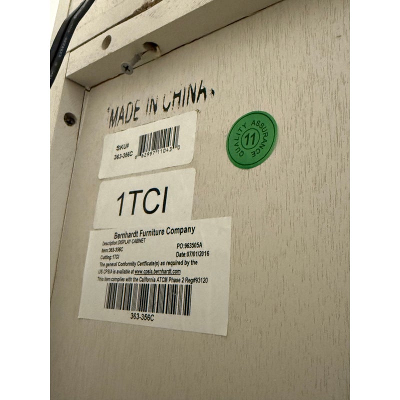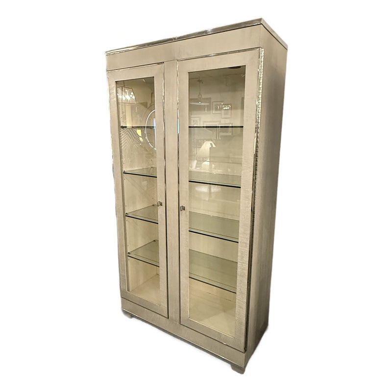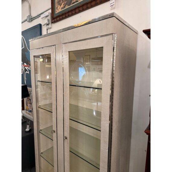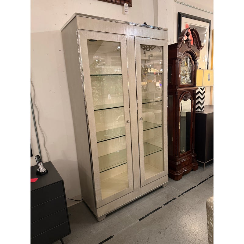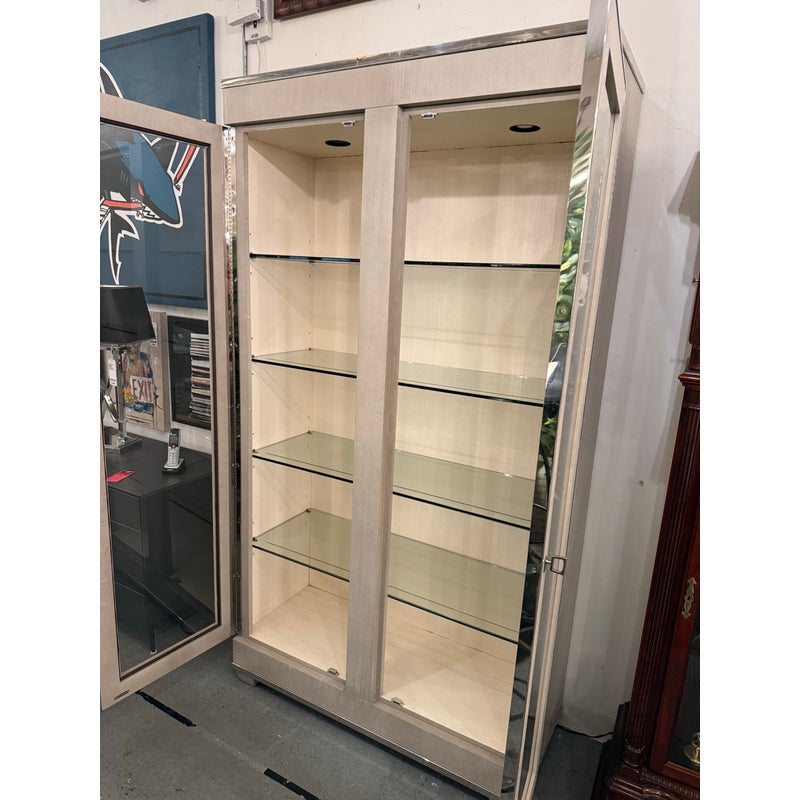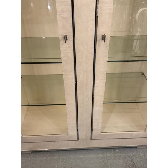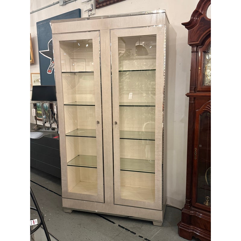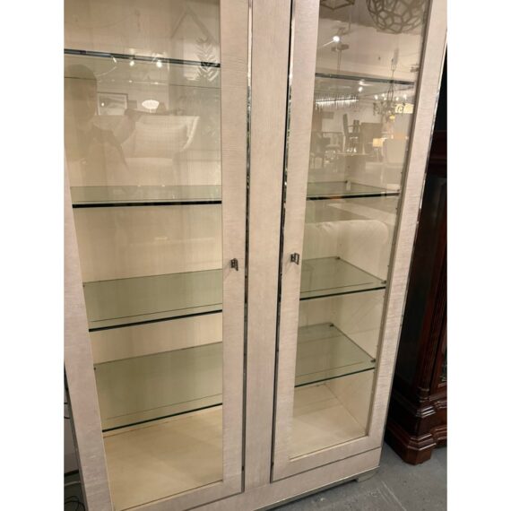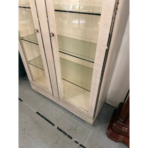 Design Plus Gallery presents the Criteria Collection Display Cabinet from Bernhardt. The cabinet is made from ash solids and quartered ash veneers in their Pale Ivory finish with a Radiant Nickel finish. The two doors have tempered, non-beveled inset glass. Behind each door are four removable tempered glass shelves with polished edge and plate groove. Weighted base for added stability. The style is no longer in production with the manufacturer. The interior light does not work and a look at by an electrician is recommended but overall the exterior and shelves are in good condition.