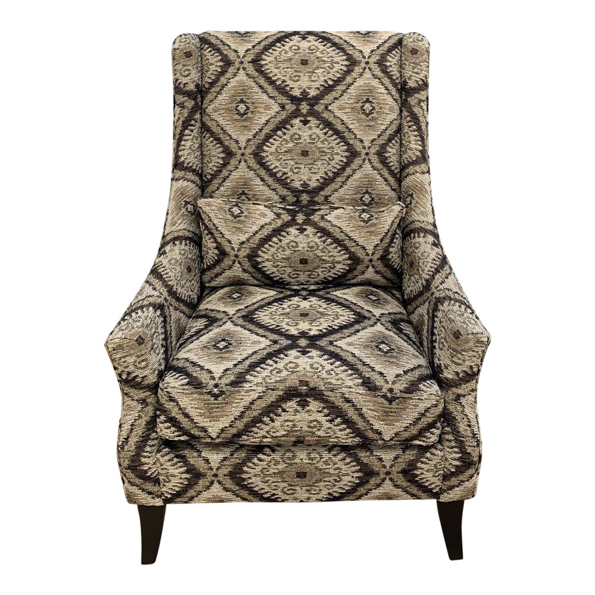 Design Pus Gallery presents a Bernhardt Fulton Arm Lounge Chair. Fabric is a large scale contract graded Suzani pattern. Legs a black finish to coordinate with the black and neutral patterning. Back and seat cushions are removable and added lumbar pillows gives lower back support. Minor wear on stained leg finish and fabric.