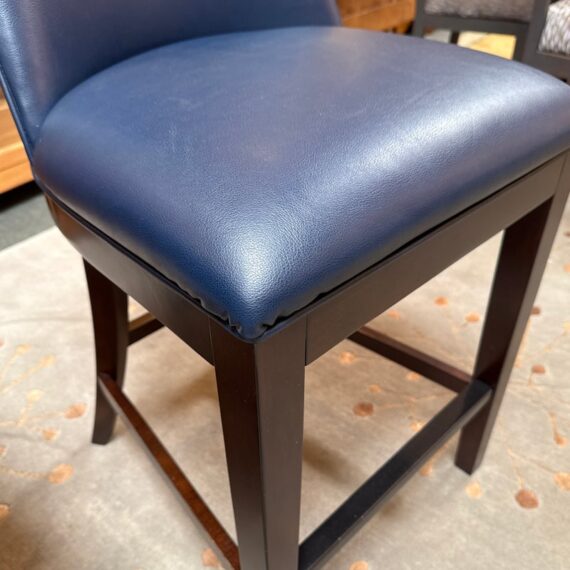 Design Plus Gallery presents a Set of 2 Blue Bailey Counter Stools by Bernhardt Furniture. The contemporary styling. The solid construction of stained mahogany wood with supple blue leather and protected foot rail. This set will undoubtedly upgrade your kitchen counter or bar space. They have minimal wear for their overall age + use.