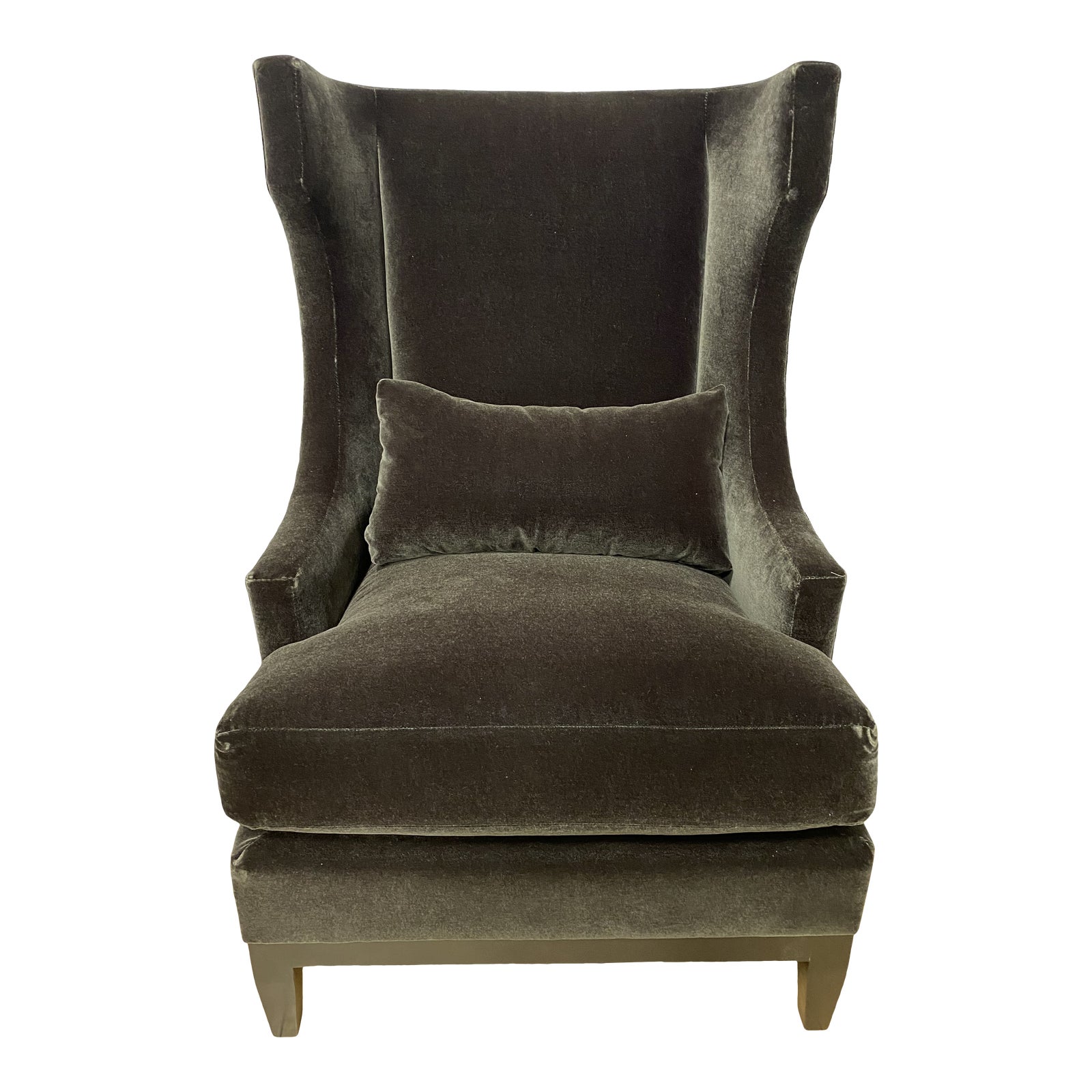 Design Plus Gallery presents a Pascal Chair by Bernhardt Interiors. Upholstered chair that will make a dramatic statement in front of a grand fireplace! Lovely in pairs with a sculptural accent table in between. Interiors is as versatile as it is stunning. Upholstered in a dark gray mohair fabric, this stylish chair features wood legs and a comfortable kidney pillow that provides ergonomic support as well as visual interest and depth. Minor wear on corners. Made in U.S.A.