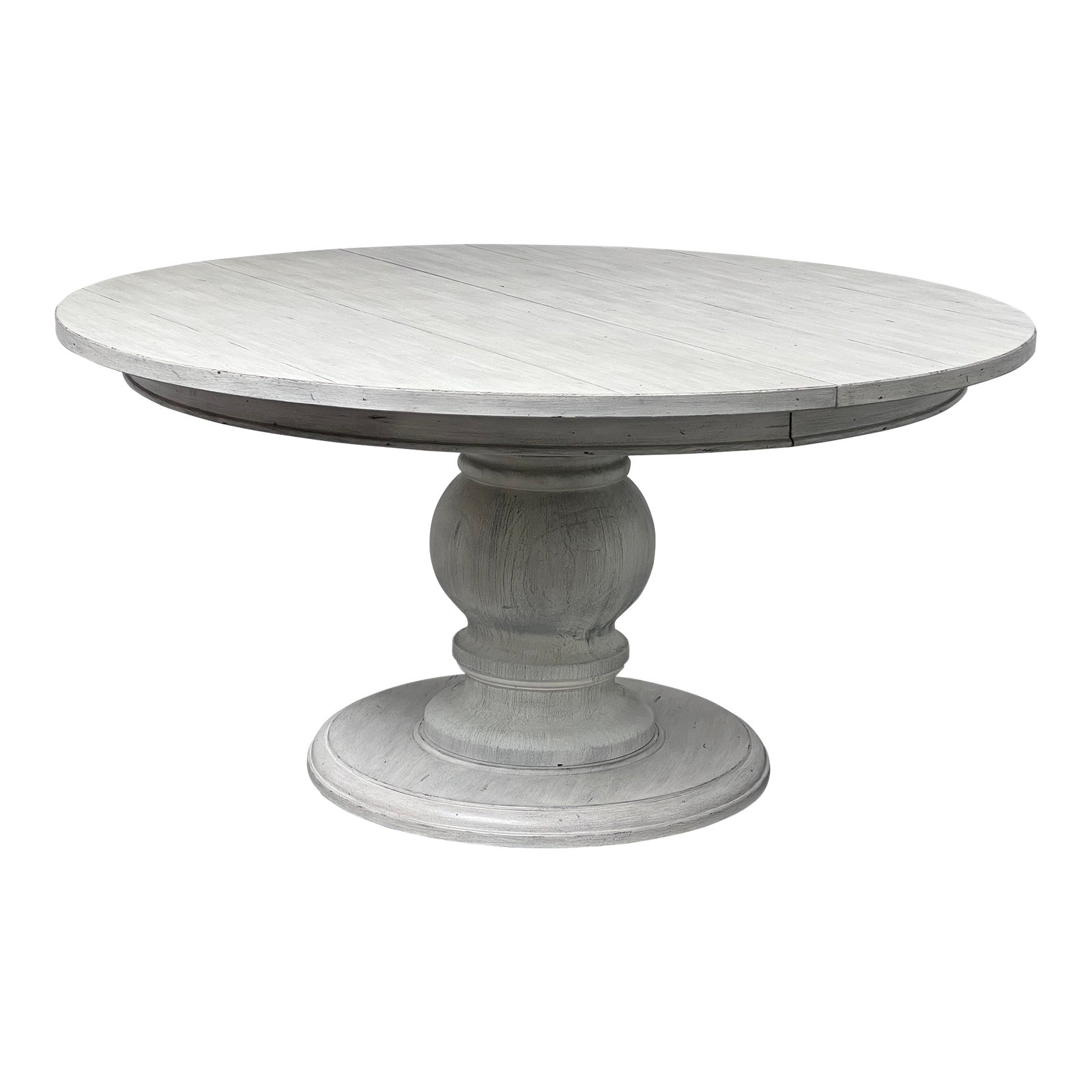 Design Plus Gallery presents a Mirabelle Round Extension Dining Table by Bernhardt. Inspired by 17th-century French provincial furnishings, a combination of elegance and beauty with casual, country-style features. A cozy dining experience with its muted white-washed wood and simple country design. With the look of a one-of-a-kind antique, it features a sculpted cast pedestal with a bottom wood base. In showroom sample condition. Made in Vietnam.
