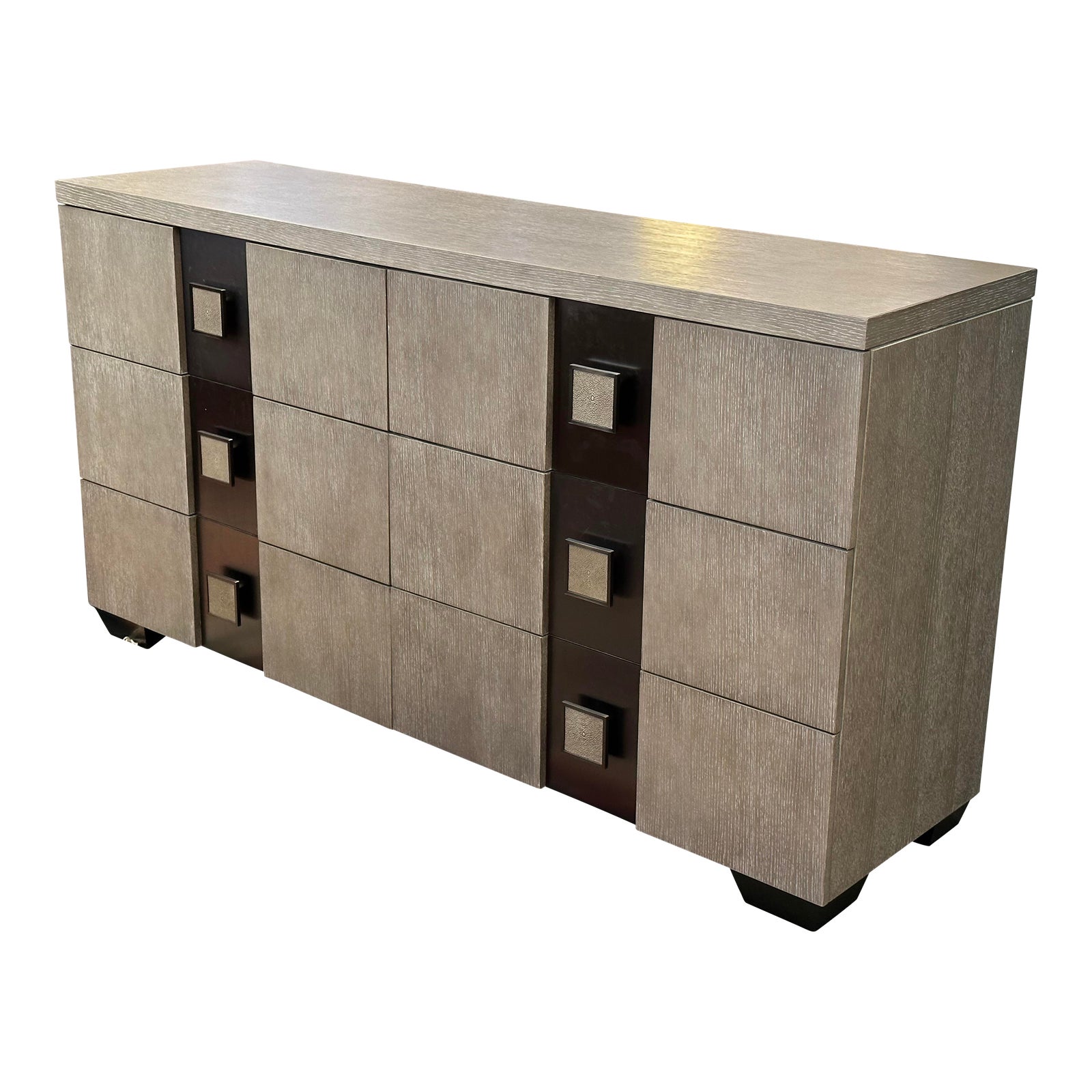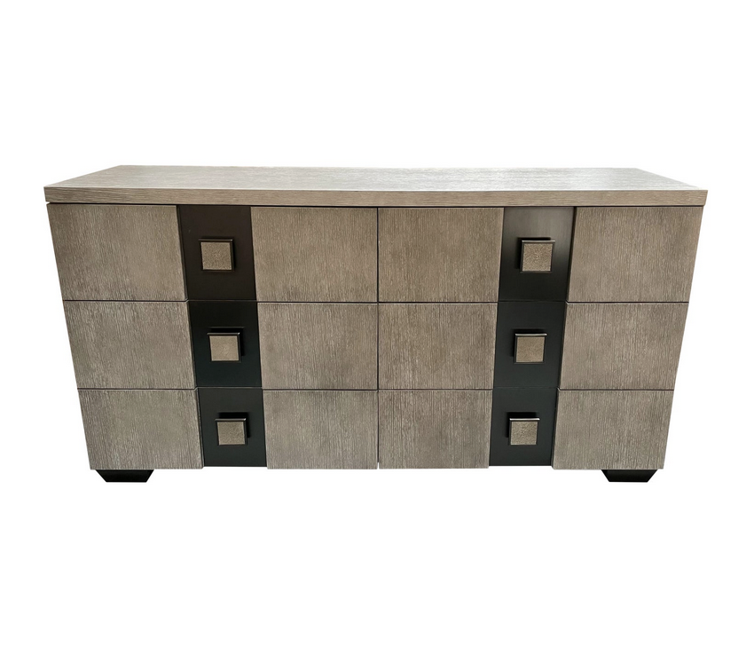 Design Plus Gallery presents a Mosaic Dresser by Bernhardt Furniture, one of America’s oldest family-owned furniture companies.This dresser would bring a unique and transitional style to any bedroom. The sophisticated combination of limed wood and dark metal makes it a perfect addition to any modern decor. Additionally, the faux shagreen drawer pulls provide a luxurious touch, while still being functional and practical. The six drawers provide lots of storage, while the smooth metal glides make it easy to open and close.