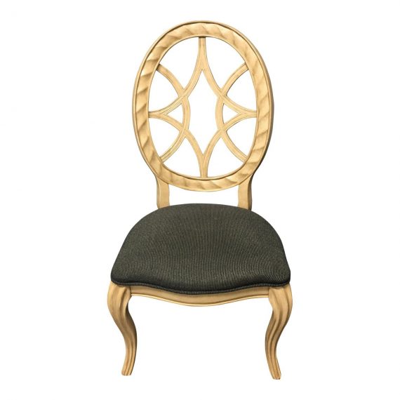 Design Plus Gallery has Bernhardt Furniture side chair. The chair has a spider web back and an upholstered seat. The seat is upholstered in a textured Charcoal Gray fabric. The frame has a Cream color painted finish. This chair would be a great desk chair or it could be quite nice as a vanity seat as well.