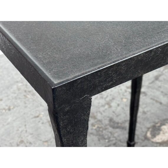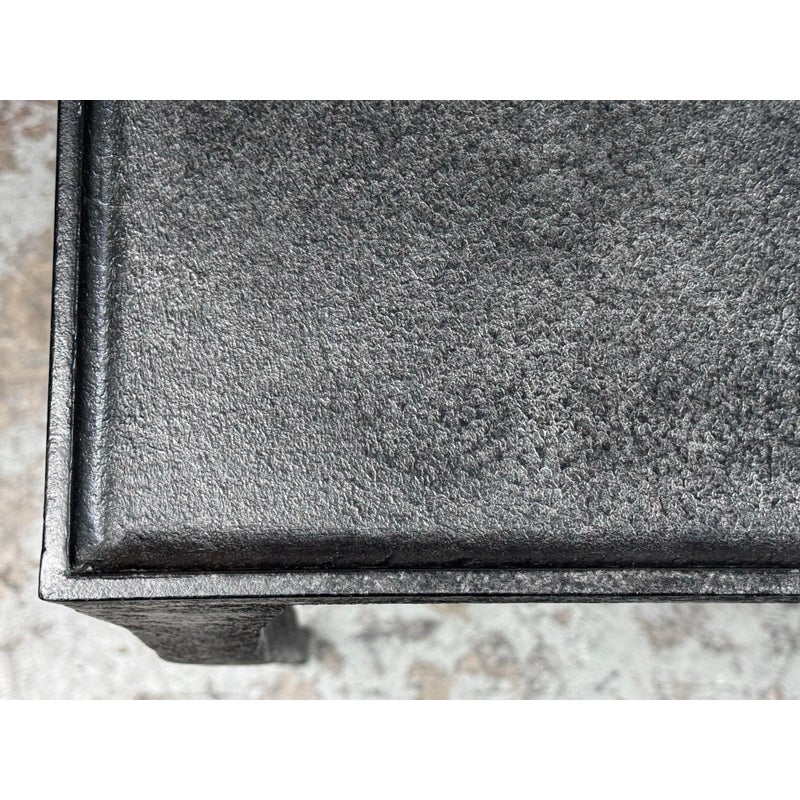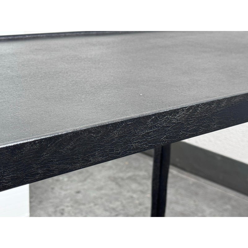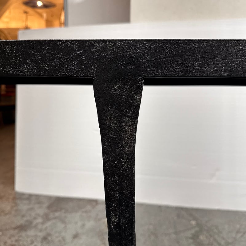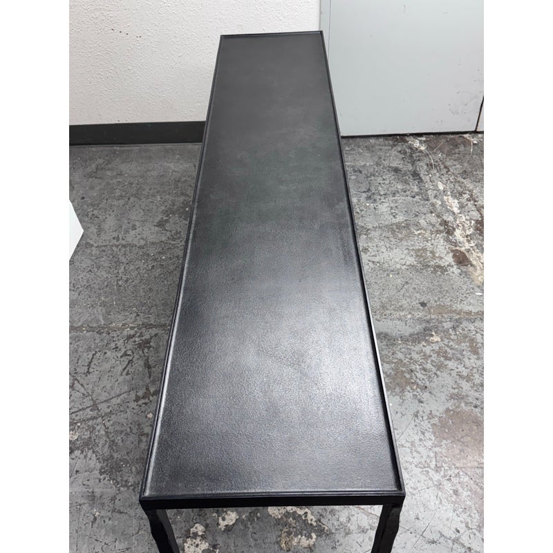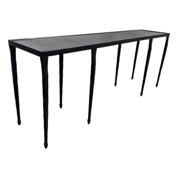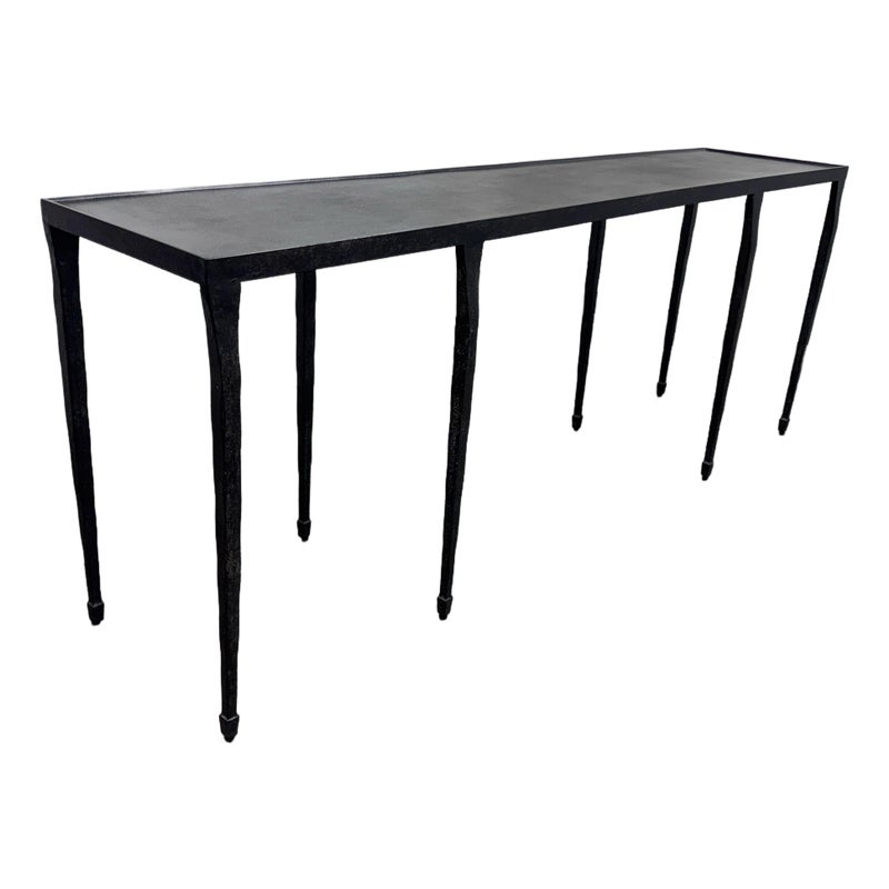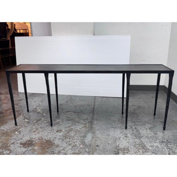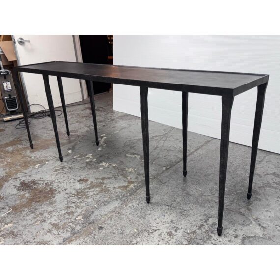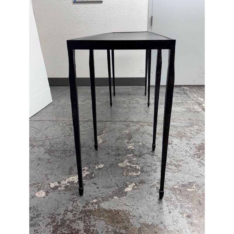 Design Plus Gallery presents a Halden Console Table from Bernhardt Interiors. This console table blends industrial character with modern grace. As decorative as it is functional, it’s crafted from hammered cast iron with a rich blackened finish. The light, contemporary silhouette is defined by four pairs of slender, tapered legs—eight in total—with cuffed bases that add a tailored touch. Elegant yet understated, it brings sculptural texture and an airy presence to any setting, making a striking first impression in an entryway, along a hallway, or behind a sofa. Versatile and refined, it effortlessly complements modern, transitional, and eclectic interiors. In good condition, visible and minimal wear from usage.