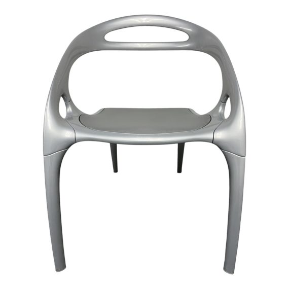 Design Plus Gallery presents a Ross Lovegrove for Benhardt “Go” Arm Chair. This futuristic chair has aerodynamic lines in a silver powdercoated magnesium frame and a white polypropylene seat. Design has a subtle sheen showcasing the curves, negative spaces, and thin legs that almost dissapear from certain angles. Manufactured in USA. Minor wear on surfaces, good condition overall.