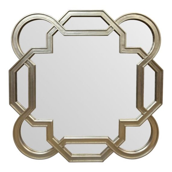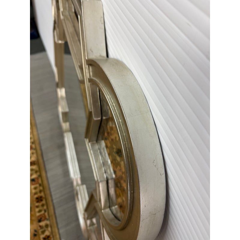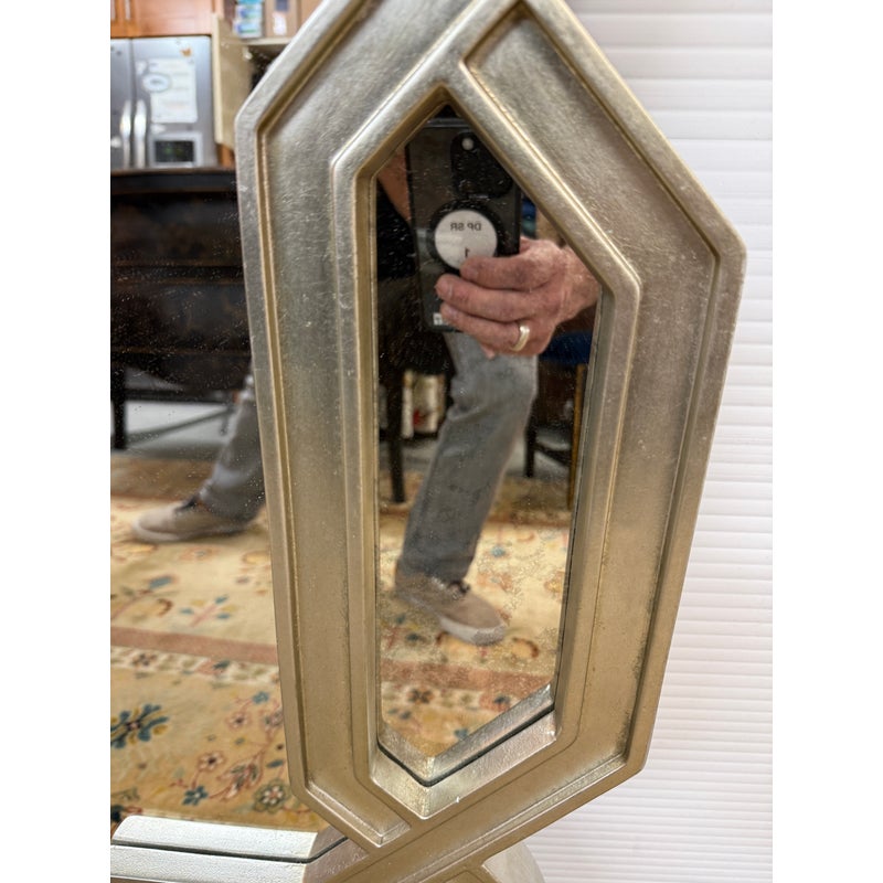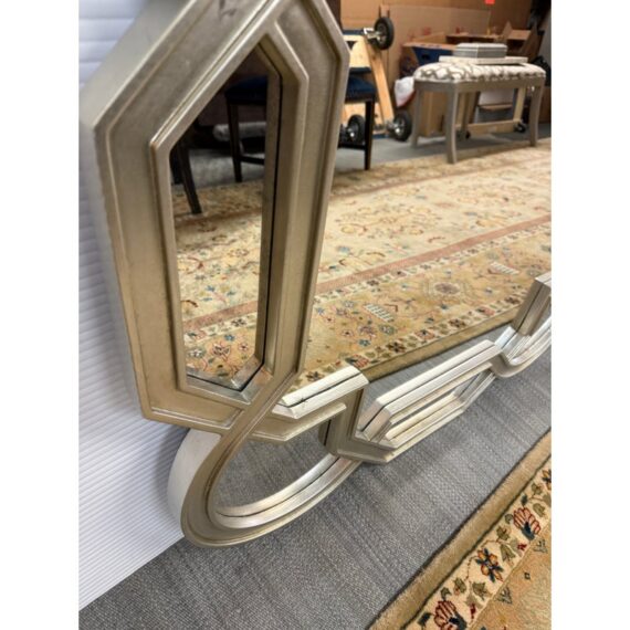 Design Plus Gallery presents the Salon Wall Mirror with Decorative Shaped Border by Bernhardt. This mirror provides an uncomplicated aesthetic with a bold yet feminine style. Combining the decorative shaped border with insets and antiqued mirror glass and non-beveled mirror glass, this piece in silver finish will complement the elegance of room styles. The mirror is no longer in production with the brand and is in good condition for its usage.
