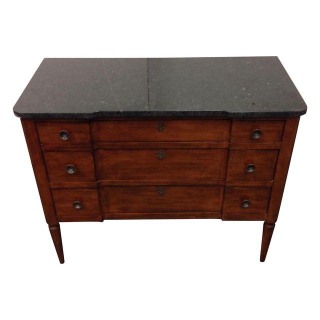 A beautiful three drawer and marble top console by Bernhardt. This piece is the perfect size for an entry way console, a small sideboard for the dining room or a small dresser for a bedroom. The top is a black, grey and white stone top.