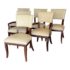 Design Plus Gallery presents a Set of Six Transitional Dining Chairs by Bernhardt. Luxurious ivory leather wraps the deep cushioning while contrasting with the dark stained frames, two of which have arms. Classic style that is timeless. In good condition, visible and minimal wear from usage + age.