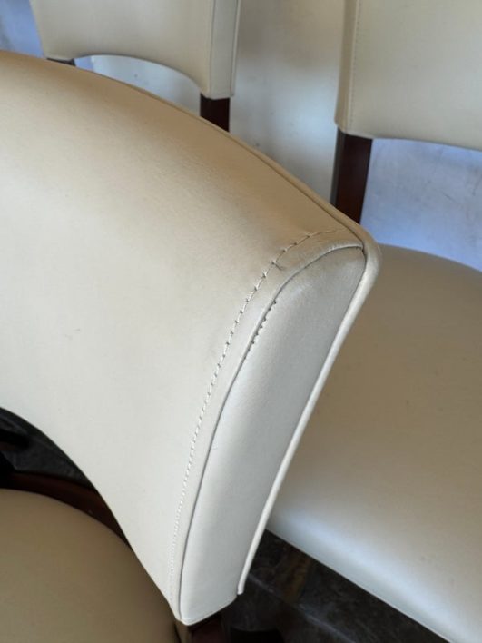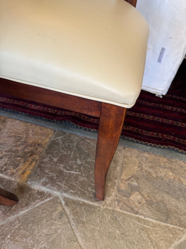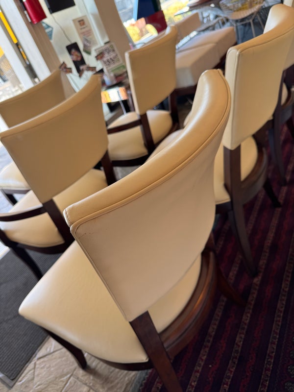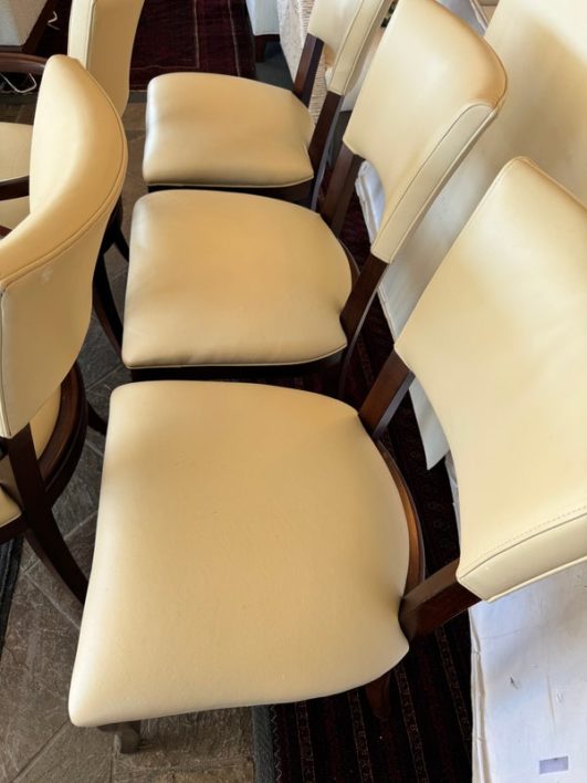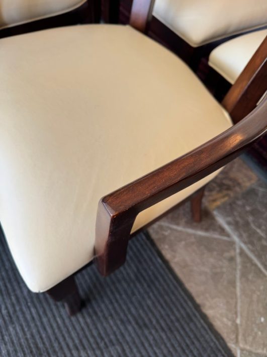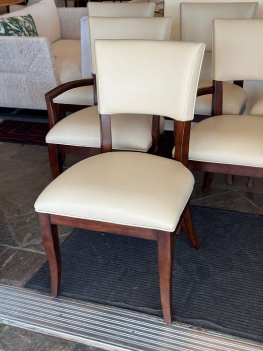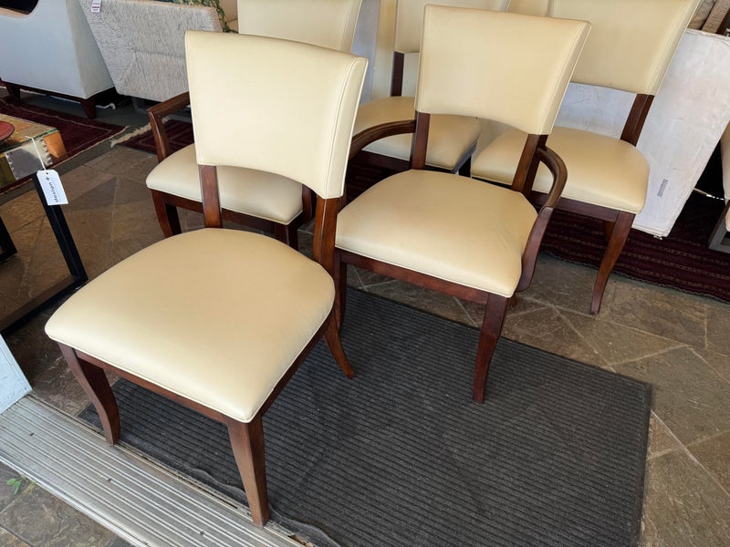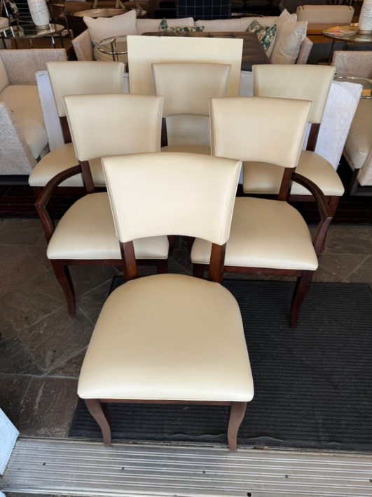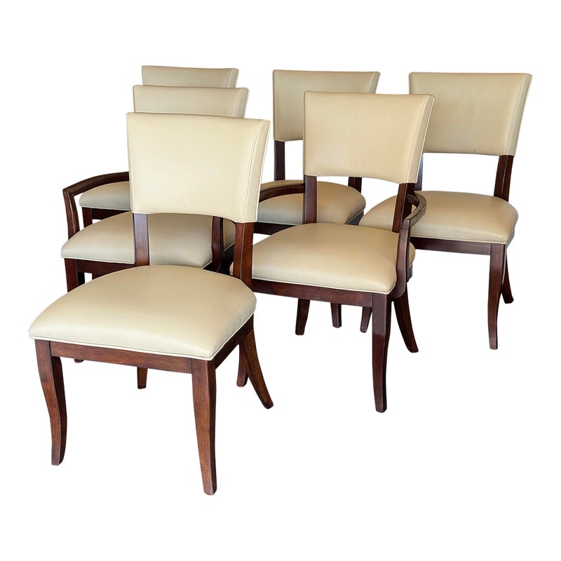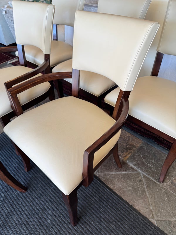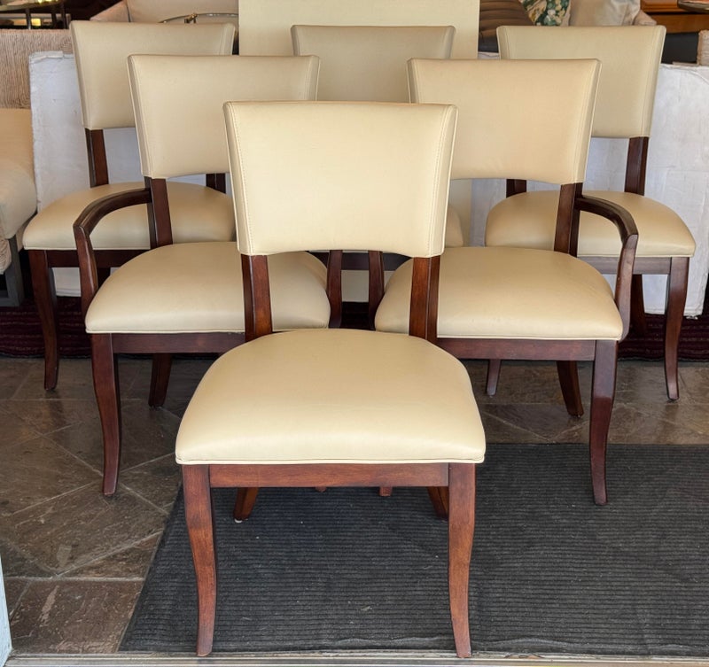 Design Plus Gallery presents a Set of Six Transitional Dining Chairs by Bernhardt. Luxurious ivory leather wraps the deep cushioning while contrasting with the dark stained frames, two of which have arms. Classic style that is timeless. In good condition, visible and minimal wear from usage + age.