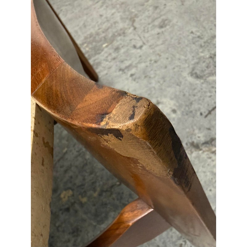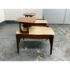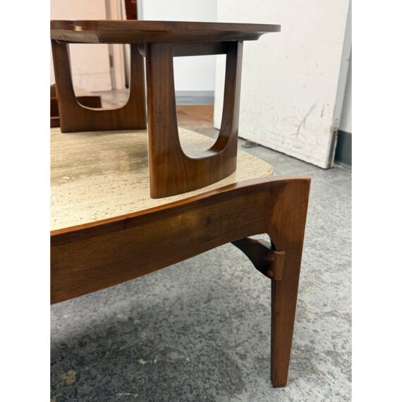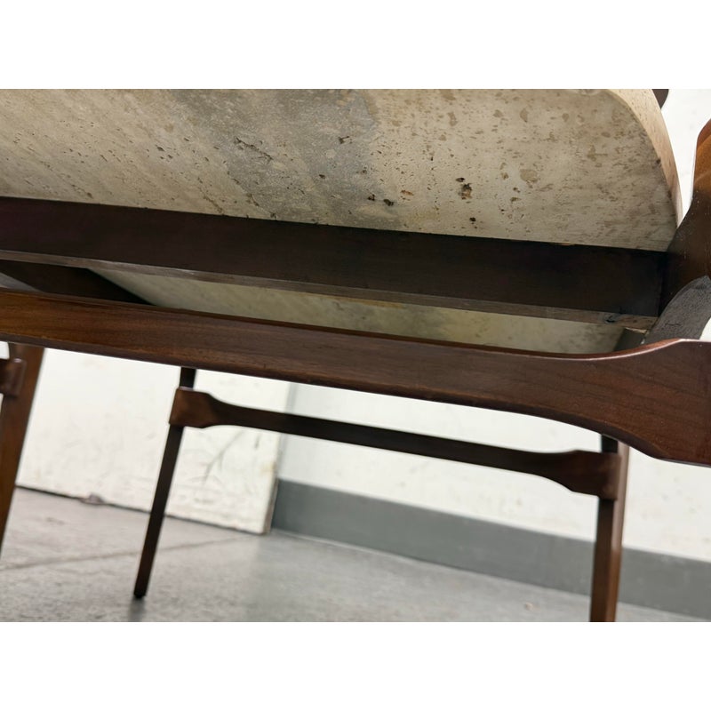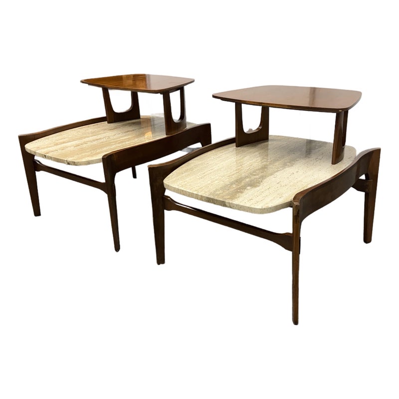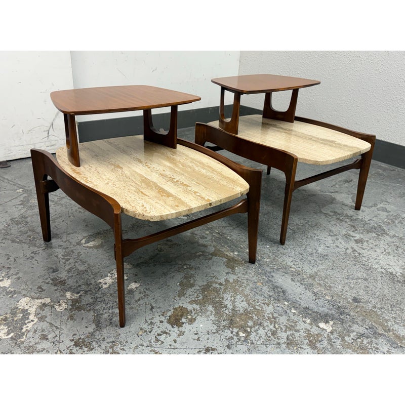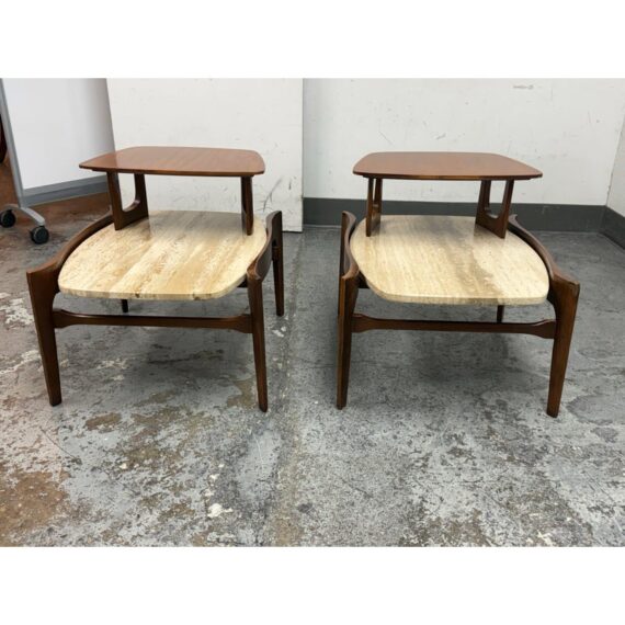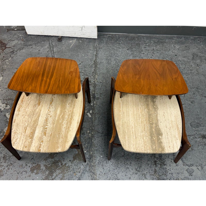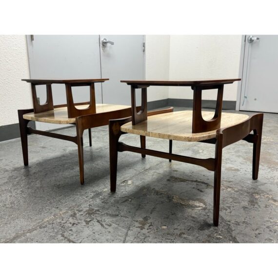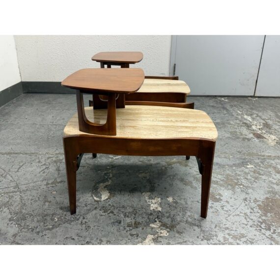 Design Plus Gallery presents a Pair of Walnut & Travertine Side Tables by Bertha Schaefer for M. Singer & Sons. These tables are made with the use of solid wood construction of walnut with stone surfaces and a two tier style. The designer was a well known maker for the Bauhaus movement and created furnishings for the well heeled for the majority of her career. These two tables are a beautiful example of the lasting endurance of the mid 20th century design movement and will last for decades more. They show visible wear that is consistent with their age but overall in good condition.