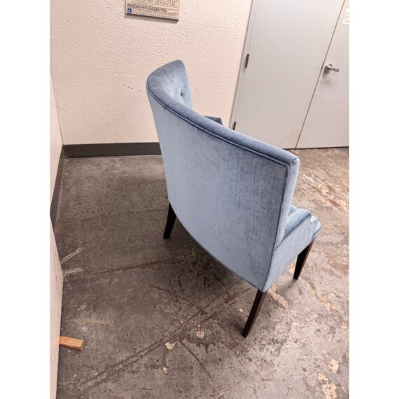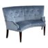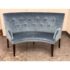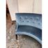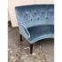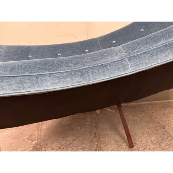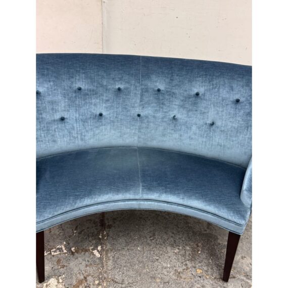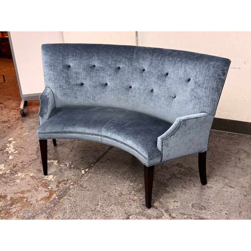 Design Plus Gallery presents a Bespoke Curved Settee. Upholstered in blue velvet with a softly contoured back and integrated arms, this piece displays button tufting across the backrest and a continuous seat that follows the graceful curve of the frame. Raised on tapered wood legs, the settee reflects a blend of classic and modern design influences with a sculptural profile. Is in good condition with visible and minimal wear from usage.