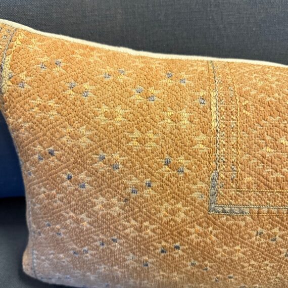 Design Plus Gallery presents a Custom Lumbar Pillow. This elongated pillow has a woven textile front in muted rust, sand, and soft blue tones with geometric patterning, stitched panel detailing, and a neutral linen back. A feather down insert is included, and the pillow has a zipper closure along the edge. It is in good condition with visible and minimal wear from usage. Made in the USA.