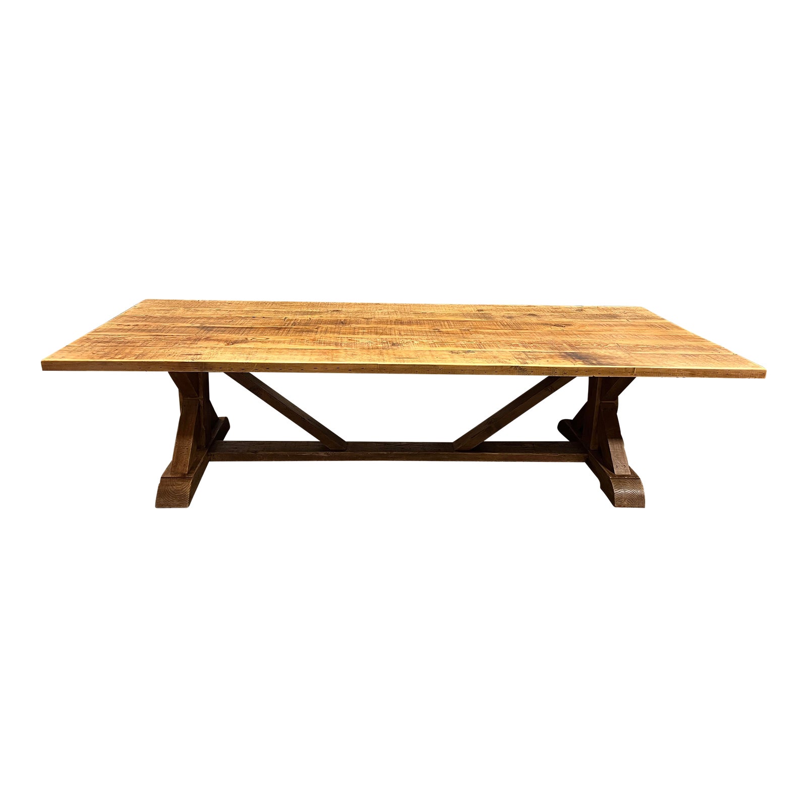 Design Plus Gallery presents Antique Rustic Country Kitchen Table by Big Daddy’s Antique. This farmhouse classic barn table is sure to grab attention. It shows off x-shaped legs with a matching wood trestle. It is an antique table that shows signs of age + wear that work with its rustic design.