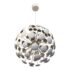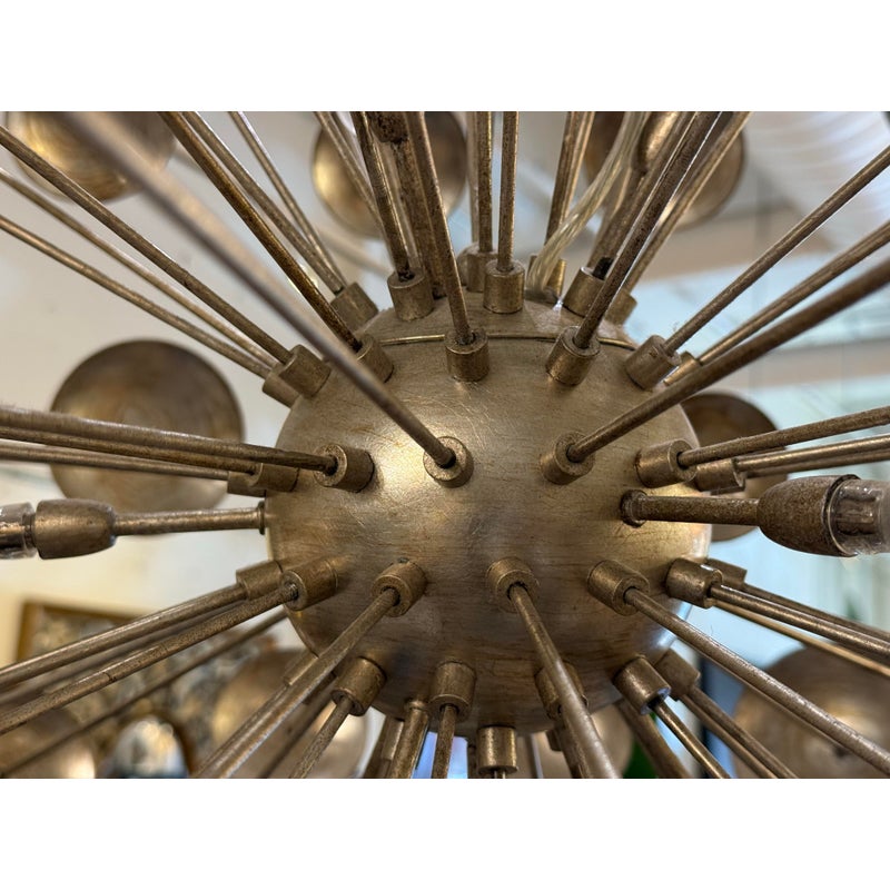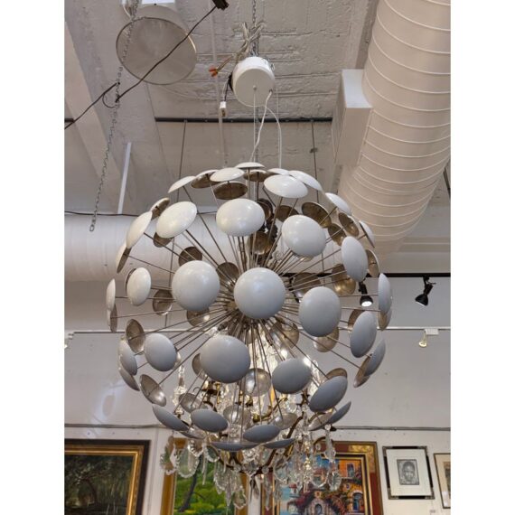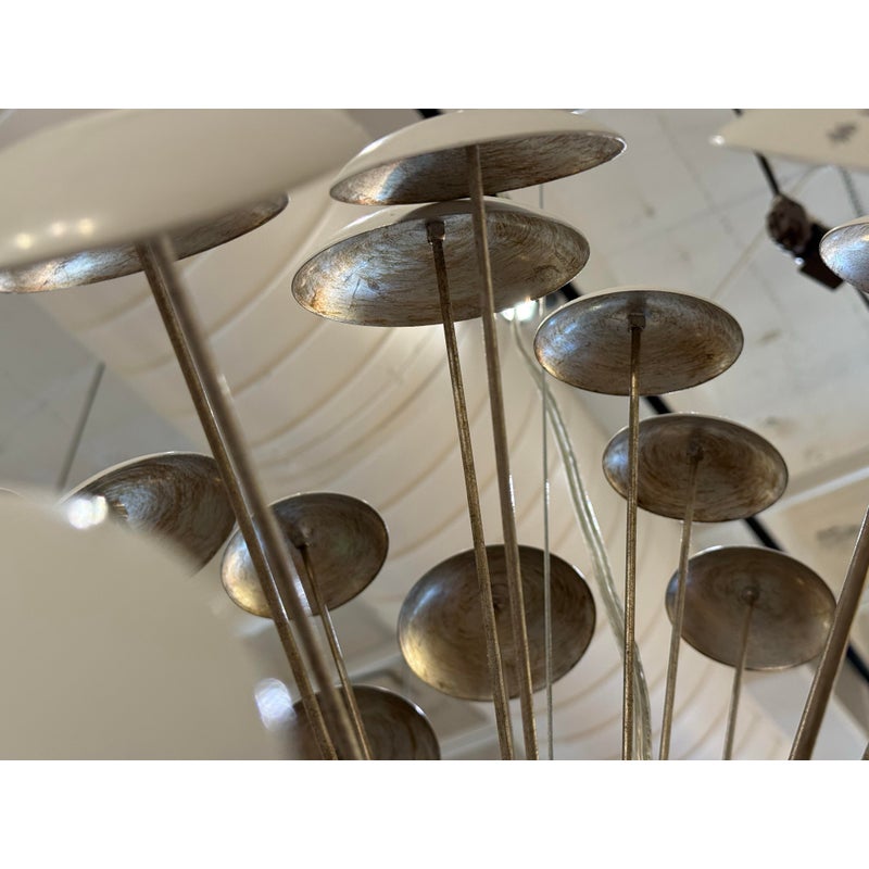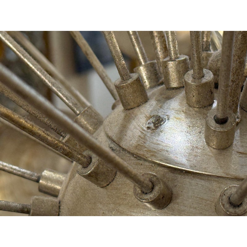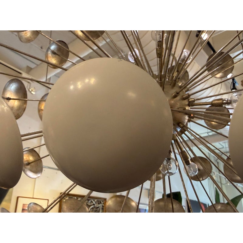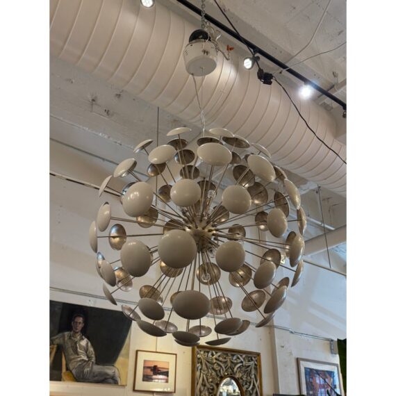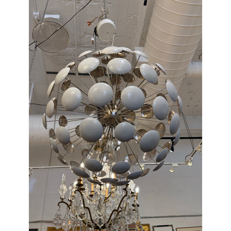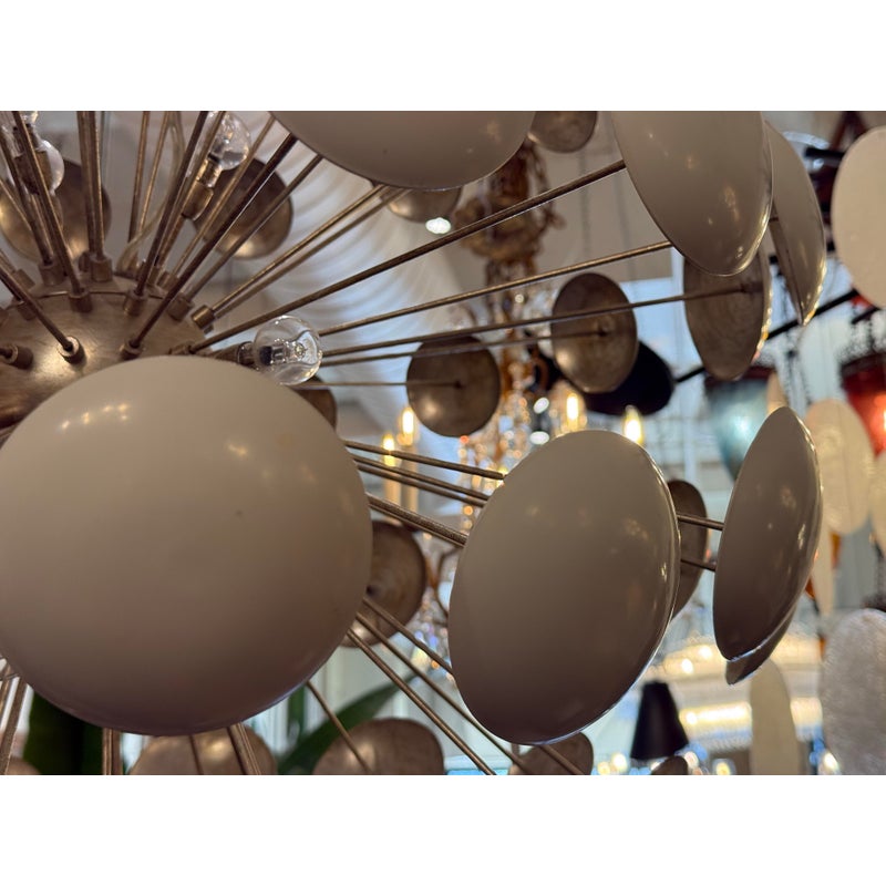 Design Plus Gallery presents a Bilbao Style Mid-Century Modern Sputnik Light Pendant. This sculptural overhead fixture displays a radiating arrangement of metal rods with alternating white enamel dish accents that create a layered orbital form. The rounded elements and starburst silhouette reflect the era’s iconic space-age influence while maintaining a balanced, graphic profile. The lighting are halogen bulbs. This is a discontinued model, two rods had broken off and was glued back on, in fair/good condition with visible and minimal wear from usage.