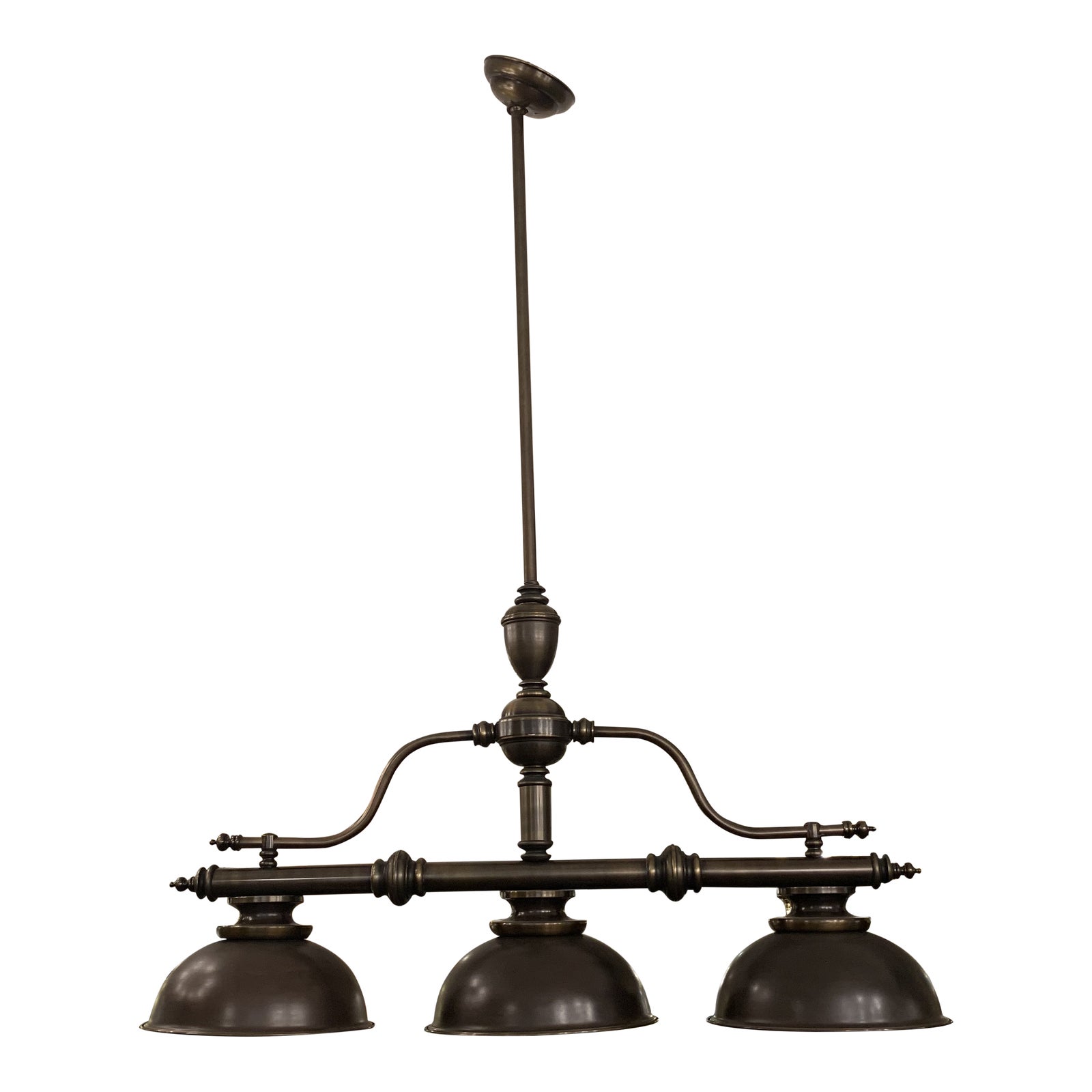Design plus gallery presents a three light billiard style pendant. Crafted from solid metals and coated with a bronze finish. Great addition for over the kitchen island, dining table, bar or pool table.